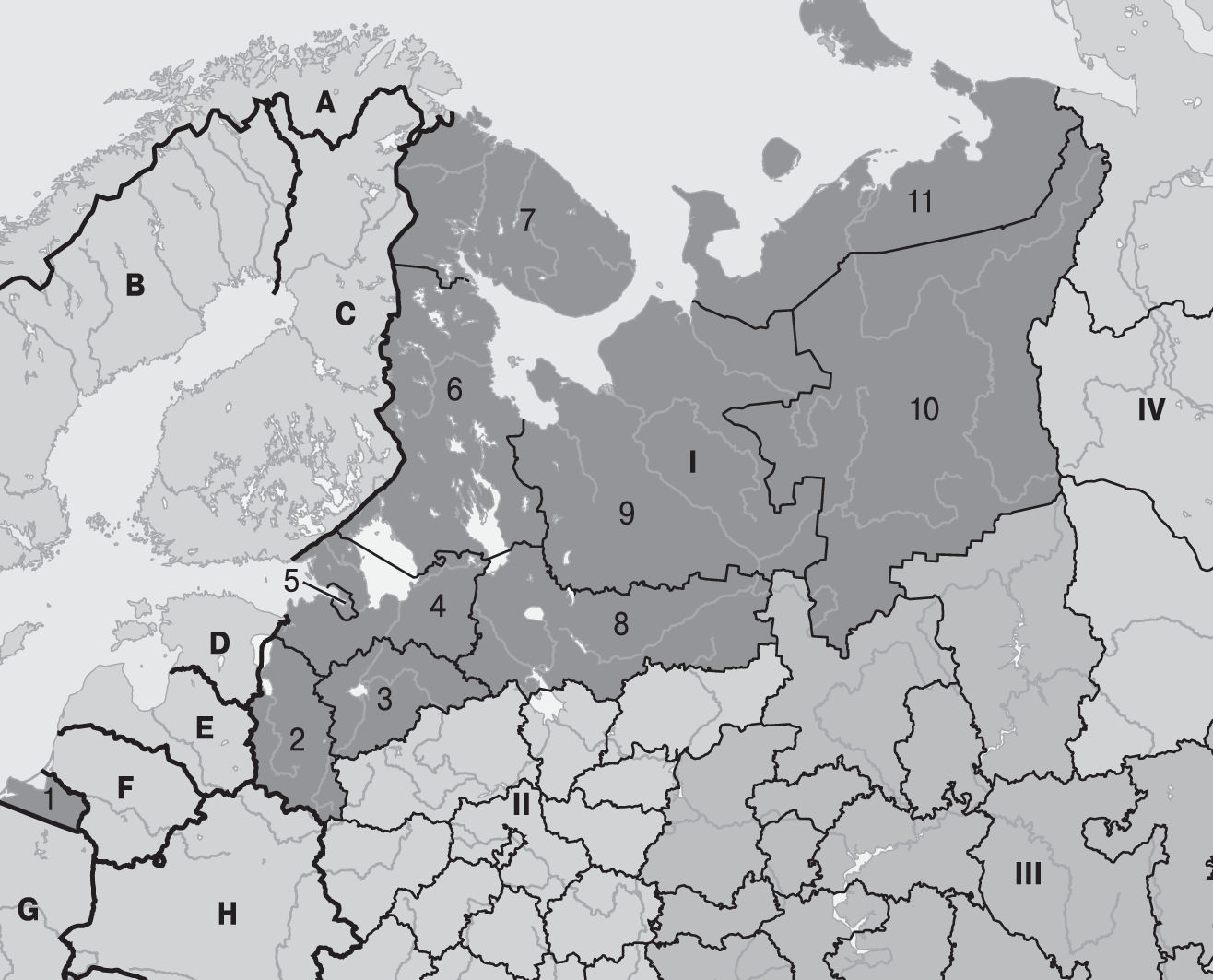 Note. A — Norway, B — Sweden, C — Finland, D — Estonia, E — Latvia, F — Lithuania, G — Poland, H — the Republic of Belarus. Federal Districts (FD): I — Northwestern FD, II — Central FD, III — Volga FD, IV — Ural FD. Regions (oblasts): 1 — Kaliningrad Oblast, 2 — Pskov Oblast, 3 — Novgorod Oblast, 4 — Leningrad Oblast, 5 — St. Petersburg, 6 — the Republic of Karelia, 7 — Murmansk Oblast, 8 — Vologda Oblast, 9 — Arkhangelsk Oblast, 10 — the Republic of Komi, 11 — Nenets Autonomous Okrug.
