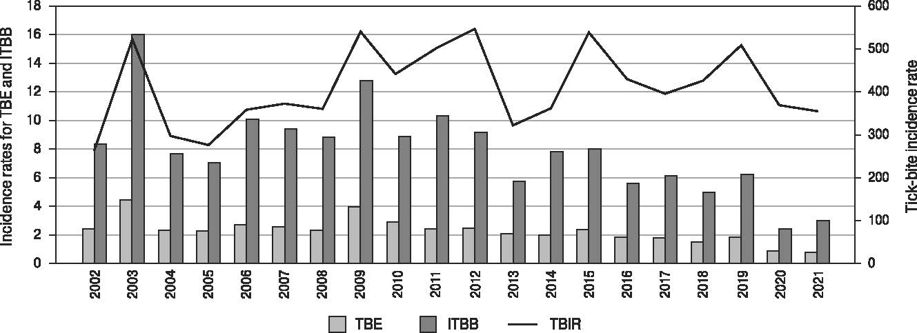Figure 2. Incidence dynamics (TBIR, TBE, ITBB) in Russia, 2002–2021