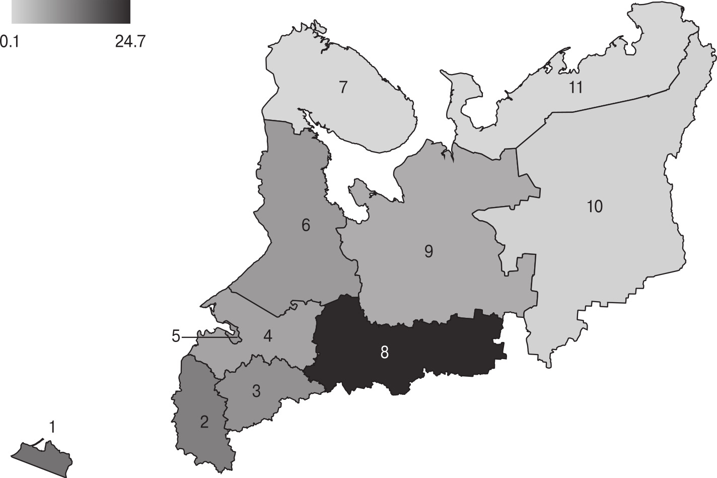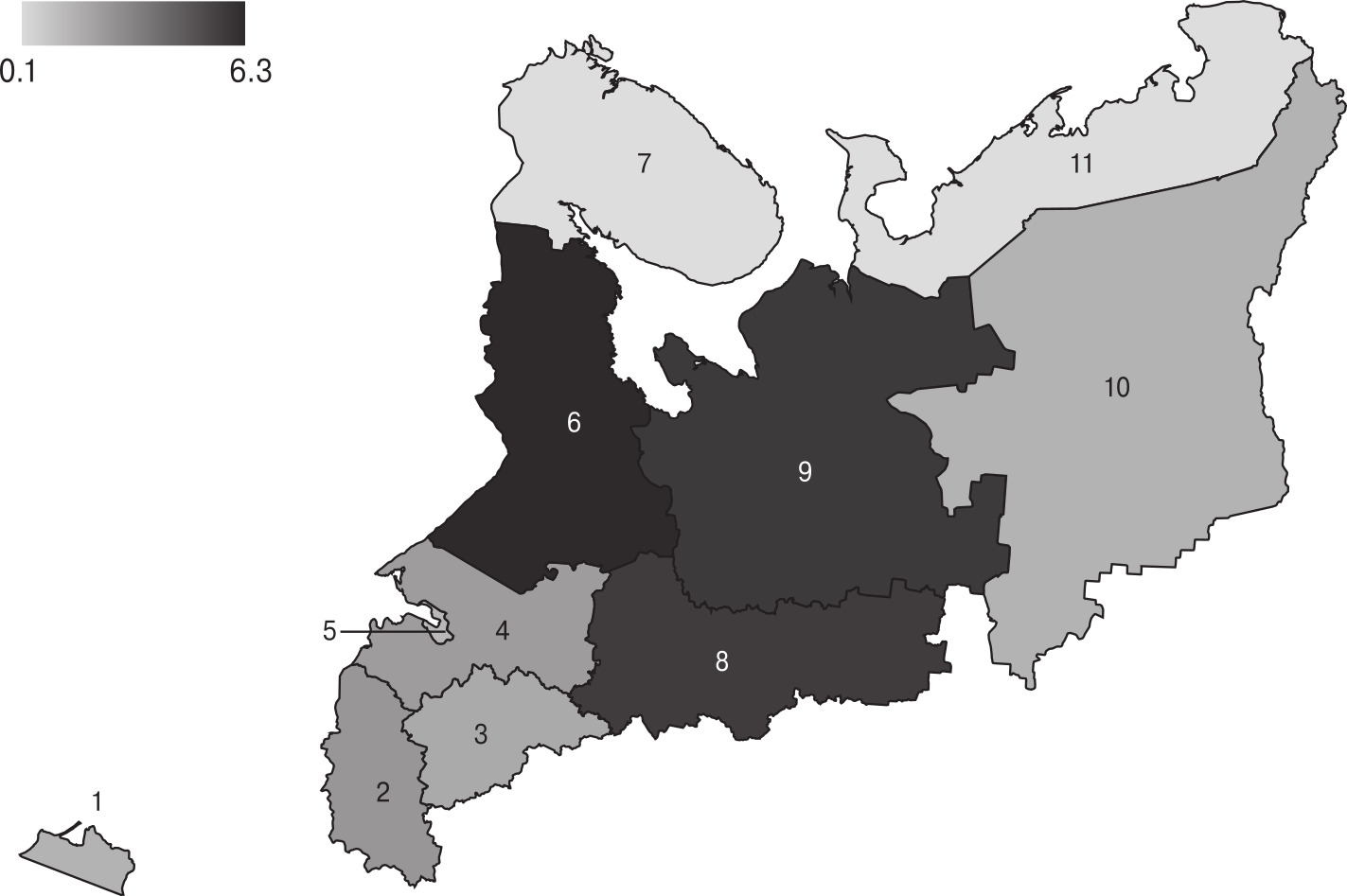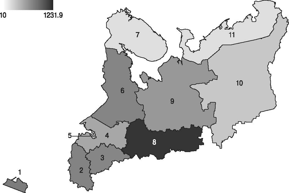Note. 1 — Kaliningrad Oblast, 2 — Pskov Oblast, 3 — Novgorod Oblast, 4 — Leningrad Oblast, 5 — St. Petersburg, 6 — the Republic of Karelia, 7 — Murmansk Oblast, 8 — Vologda Oblast, 9 — Arkhangelsk Oblast, 10 — the Republic of Komi, 11 — Nenets Autonomous Okrug.