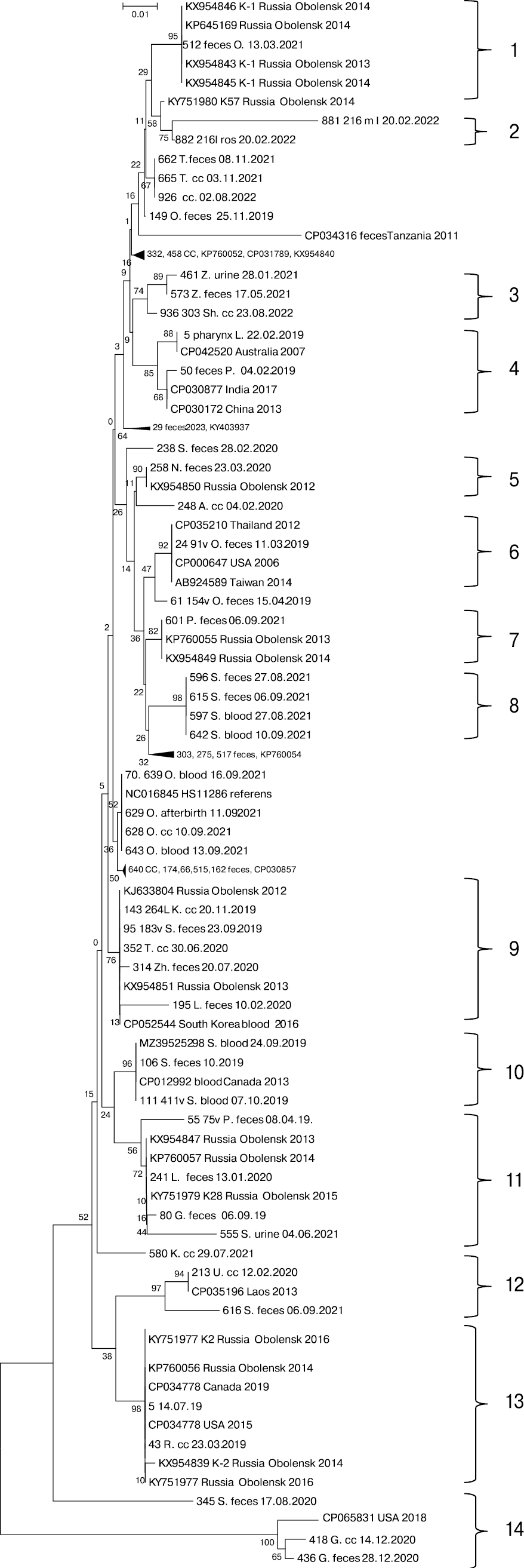 Штаммы, сгруппировавшиеся в четвертом, шестом, девятом, десятом, одиннадцатом и тринадцатом кластерах, описаны нами ранее под VI, I, II, V, IV, VII номерами соответственно [4]. Девятый (II) и одиннадцатый (IV) кластеры, так же как и охарактеризованные ранее, содержат штаммы, выделенные в 2019 г., они пополнились штаммами, выделенными из фекалий новорожденного ребенка и из отделяемого цервикального канала в 2021, 2022 гг. Штаммы, генетически близкие изолятам из четвертого (VI), шестого (I), десятого (V) и тринадцатого (VII) кластеров не удалось выделить на протяжении 2020–2023 гг.