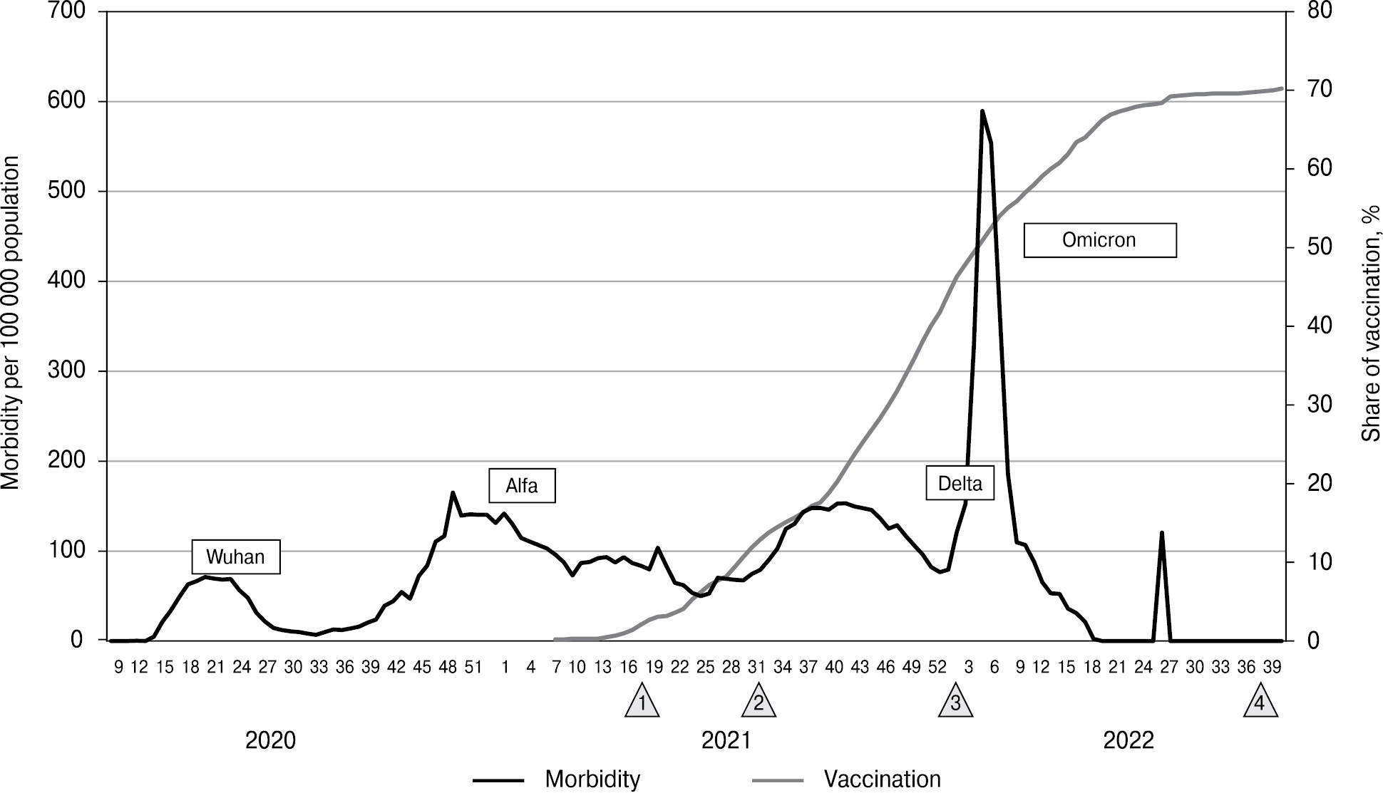 It should also be noted that booster re-vaccination was launched among the population starting from the 40th week of 2021. In result, vaccine coverage of the population had reached almost 70% of the threshold starting from the 19th week of 2022. A sharp decrease in incidence to only sporadic levels immediately followed. This is fully consistent with existing theories which assert that achievement of 70% seroprevalence represents a threshold leading to interruption of pathogen transmission [31, 33]. This fact likely explains certain dynamics: the weak collective response to the introduction of the Delta variant into the RB; and the brief peak in morbidity associated with circulation of Omicron B1.1.529 strains (Fig. 1).