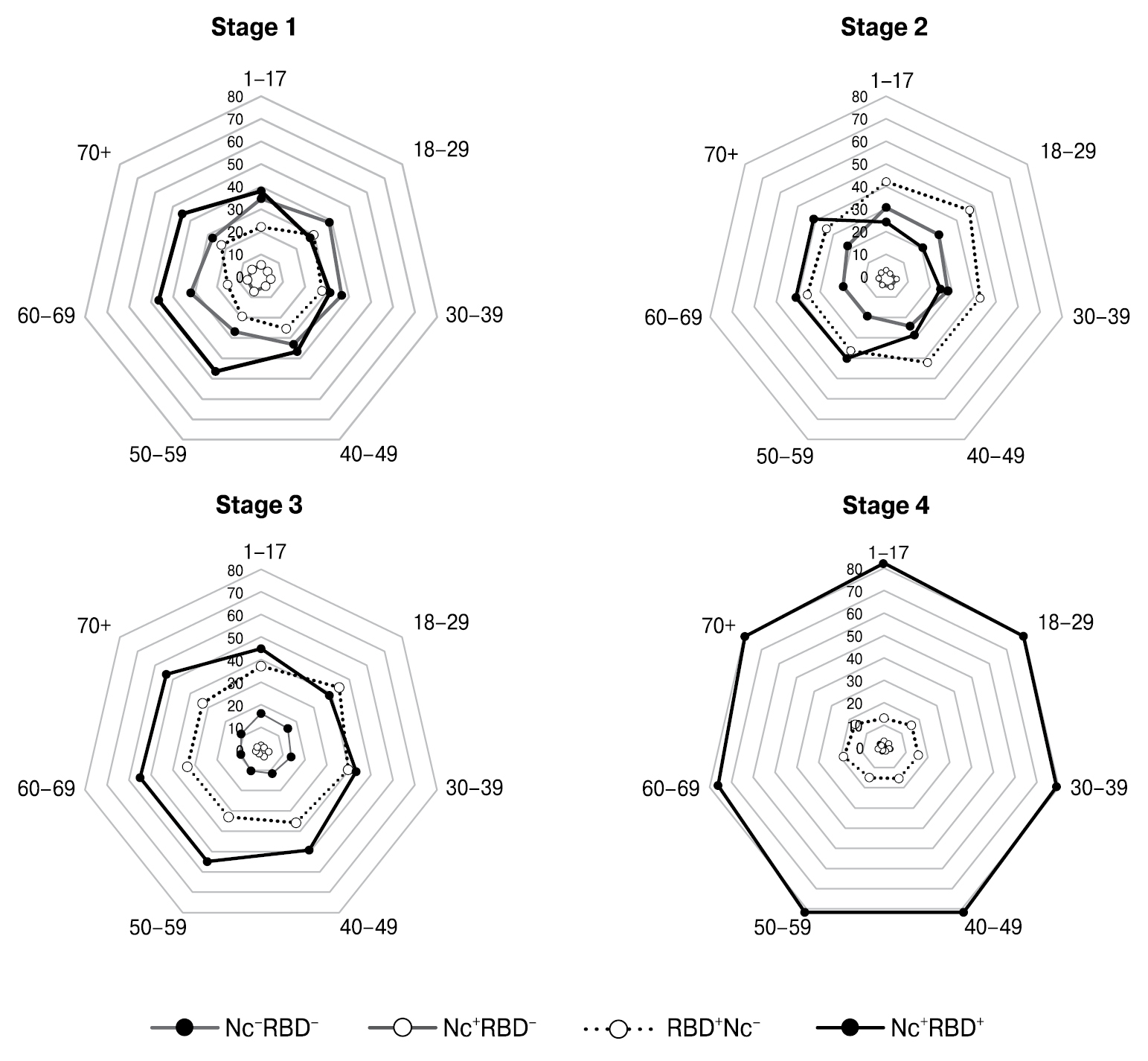 Stage 2 was characterized by an increase in the proportion of RBD+Nc– in almost all population groups: from 22.7% (95% CI: 21.6–24.0) in stage 1 to 39.5% (95% CI: 38.1–40.9); differences were significant at p < 0.0001 (Fig. 4, Table S3). The shares of all other categories, on the contrary, decreased: Nc–RBD– by 1.3-fold; Nc+RBD– by 1.5-fold; and Nc+RBD+ by 1.2-fold. The differences were significant (p < 0.05).