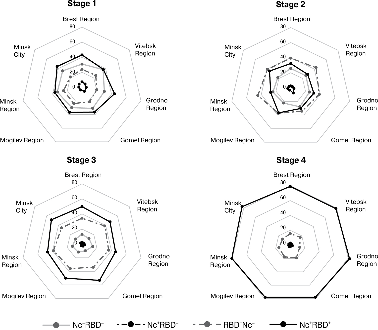 Thus, the dynamics of SARS-CoV-2 collective immunity among the populations of different administrative regions in the RB turned out to be generally the same: a prevailing trend featuring an increasing in the share of Nc+RBD+; associated breaks in viral transmission; followed by the near cessation of COVID-19 epidemic incidence, at least in terms of manifest forms of infection.