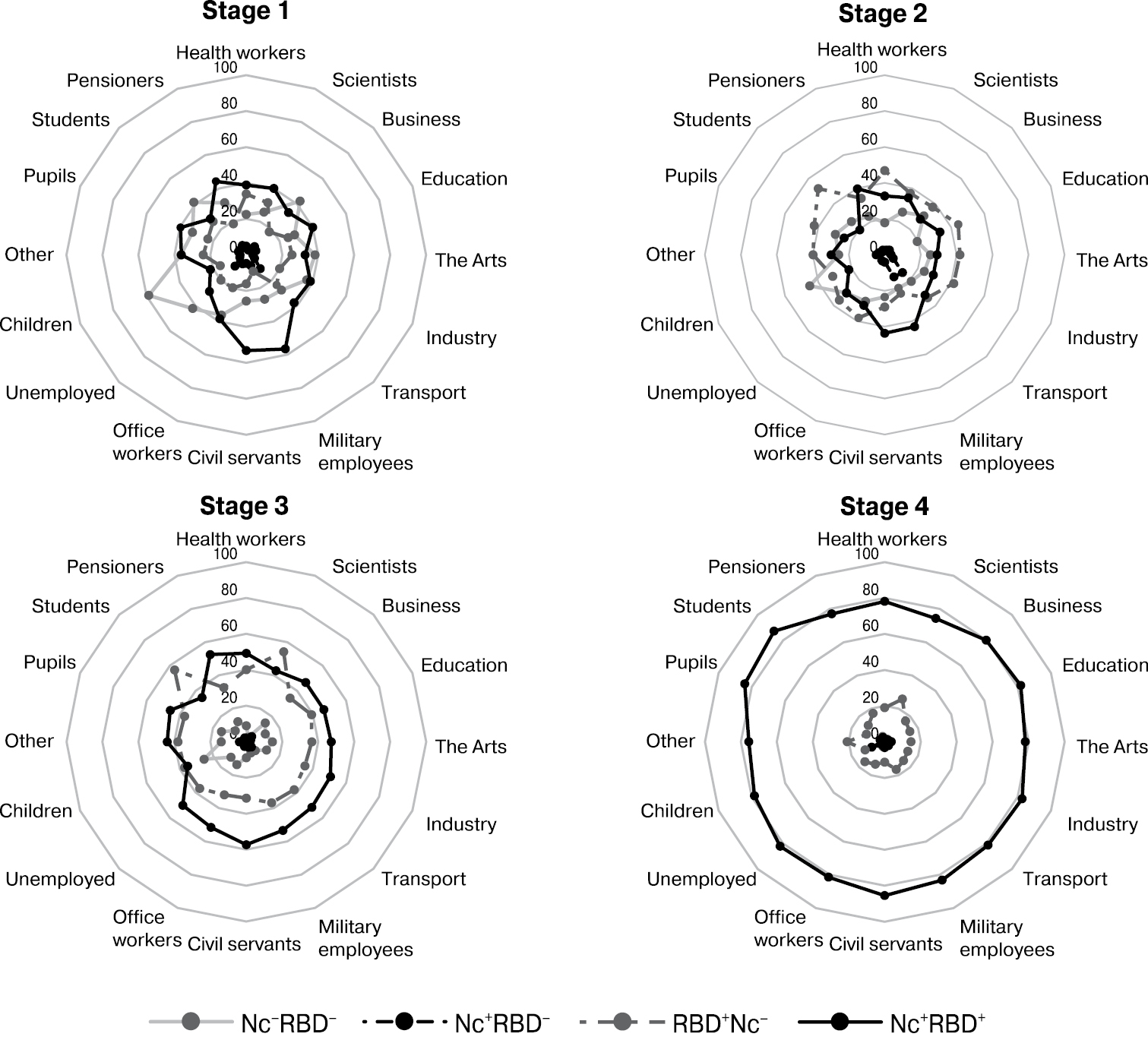 In the 1st stage, a noticeable spread in the shares of Nc–RBD–, RBD+Nc– and Nc+RBD+ was observed (Fig. 4). When calculating the variance, the largest value was noted in Nc–RBD– (81.86); the smallest was in RBD+Nc– (35.64). The share of Nc+RBD– was only 5.4% (95% CI: 5.1–6.1); the dispersion was 4.18. The largest proportion of Nc–RBD– was observed among children (58.8%; 95% CI: 44.2–72.4). In the Nc+RBD+ group, the maximum proportions were found among military personnel (56.7%; 95% CI: 37.4–74.5) and civil servants (53.3%; 95% CI 44.1–62.2) (Table S3).
