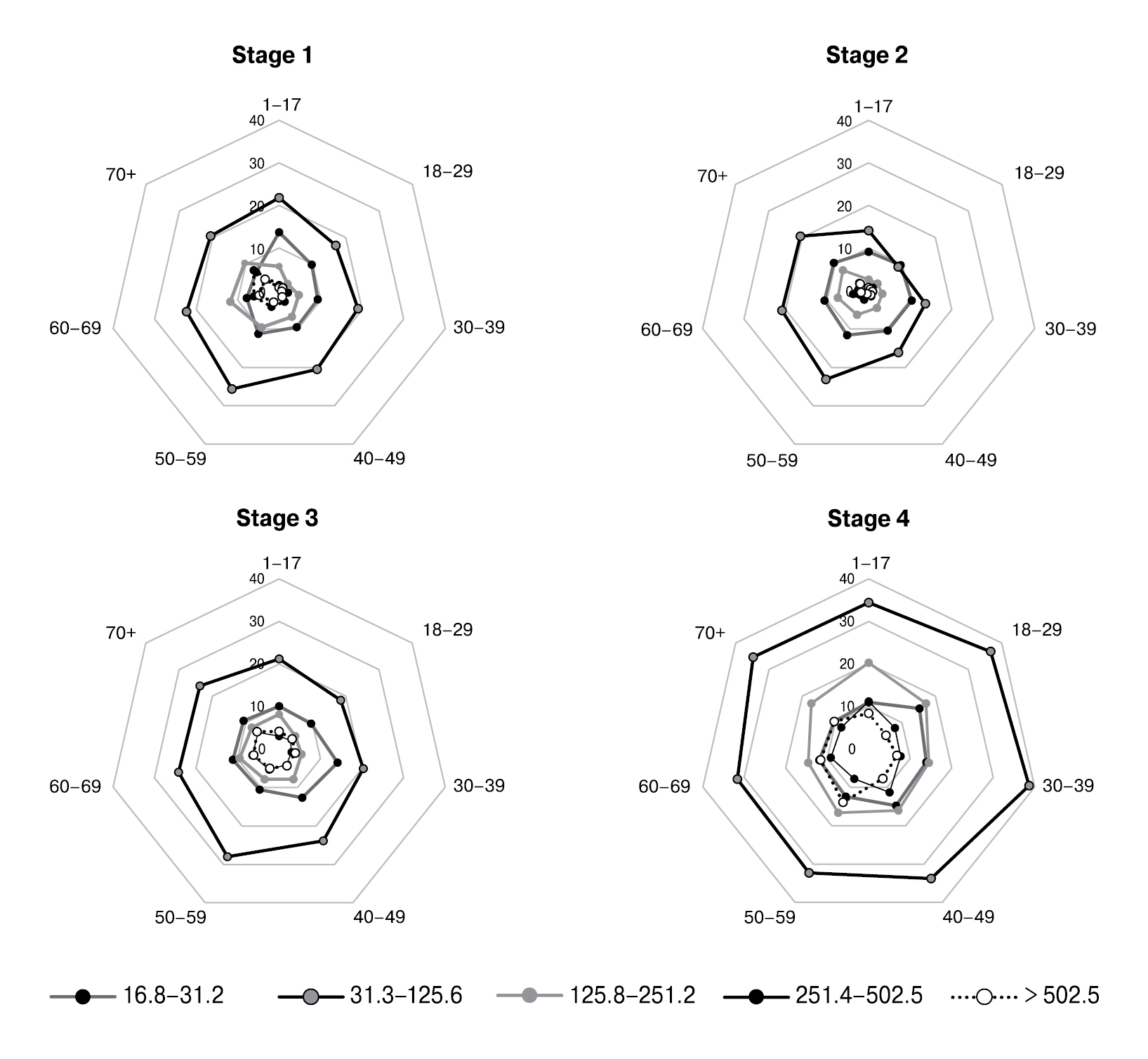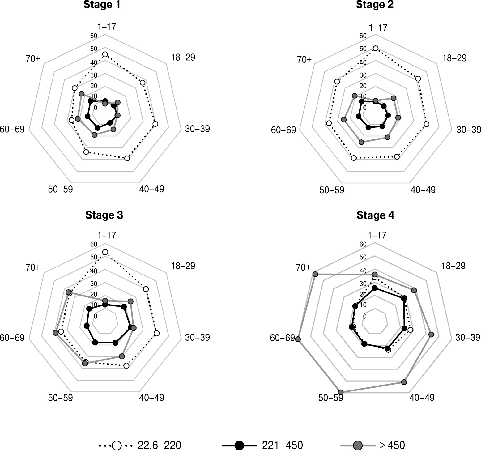 The most important contributor in herd immunity turned out to be due to population vaccination, with coverage reaching 70% by stage 4. Among vaccines, compared with whole-virion, inactivated BIBP-CorV vaccine the Sputnik V and Sputnik Light vector were used most often.