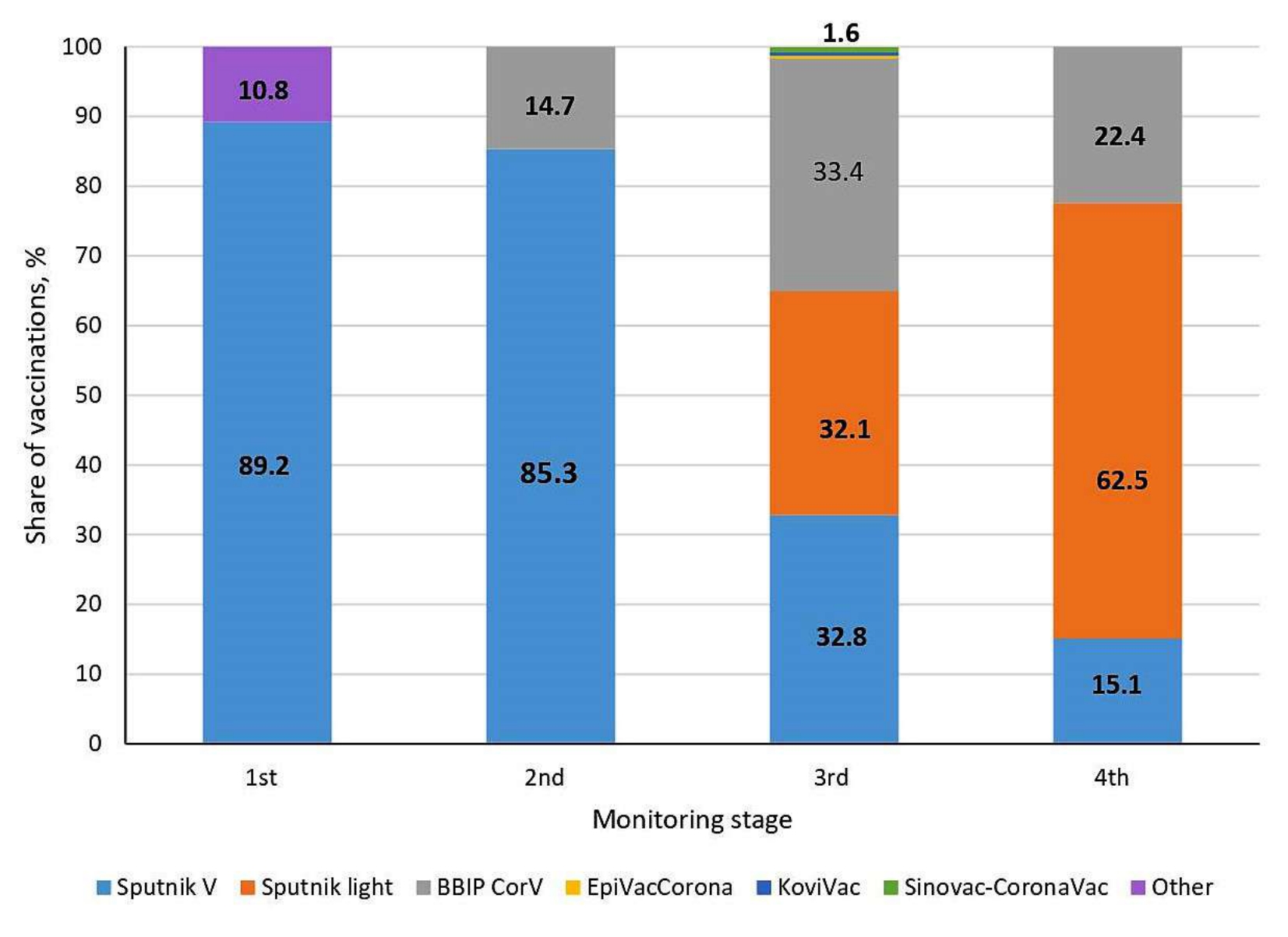 Some of volunteers participated in coronavirus vaccination deployed in the RB. In the 1st stage, 1168 people in the cohort were vaccinated. Of these, 85.3% received the Gam-COVID-Vac vector vaccine (Sputnik V, Gamaleya National Center for Epidemiology and Microbiology, Moscow, Russia), and 14.7% received the inactivated BBIBP-CorV vaccine (Sinopharm Group Co., Ltd., Shanghai, PRC). By the second stage, 1179 volunteers were vaccinated, with 85.3% receiving the Sputnik V vaccine, 14.0% receiving BBIBP-CorV, and about 1% receiving other vaccines. By the 3rd stage, another 1371 volunteers had been vaccinated. At the same time, the share immunized with Sputnik V vaccines was 87.2%, and the share vaccinated with BBIBP-CorV was 12.7%. In the 4th stage, 1196 people were vaccinated, with 85.4% receiving Sputnik V and 14.5% receiving BBIBP-CorV.