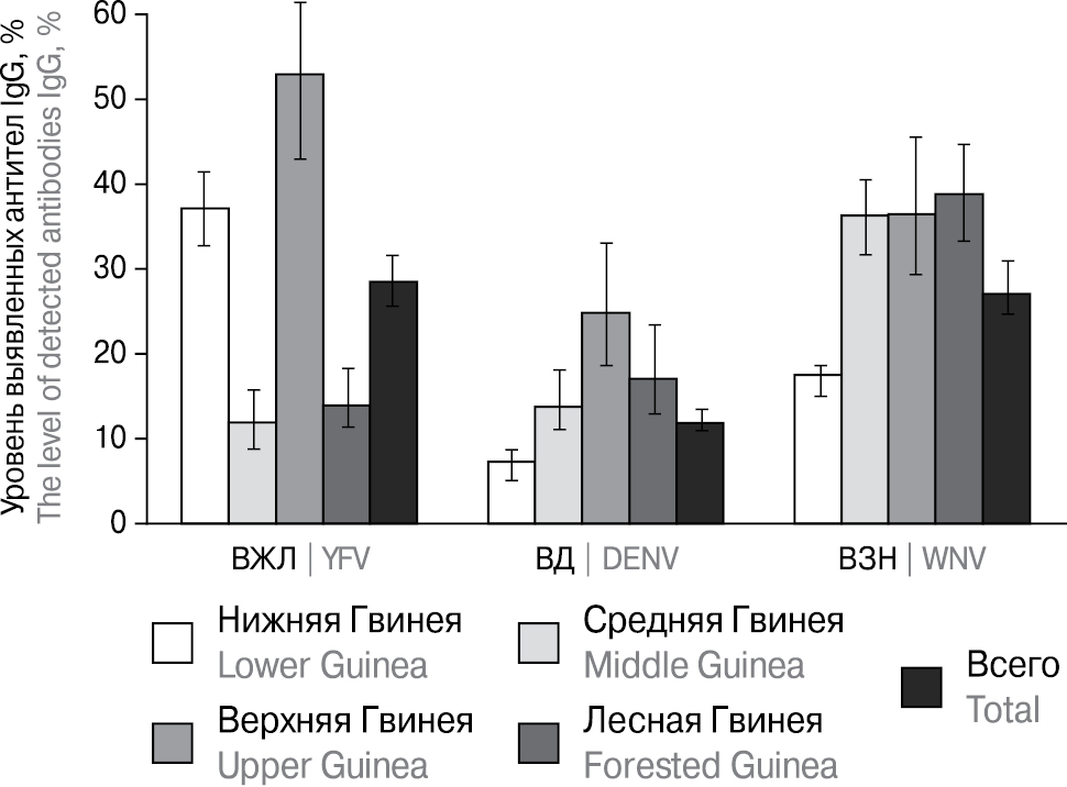 One of the most common arboviruses in the world are representatives of the genus Orthoflavivirus (family Flaviviridae). On the territory of the Republic of Guinea, the circulation of such representatives of this family as the yellow fever virus (YFV), West Nile virus (WNV) and dengue virus (DENV) has been confirmed. The aim of the study was to determine the level of specific IgG class antibodies to YFV, DENV and WNV in residents of various landscape– geographical zones of the Republic of Guinea by the ELISA method. Materials and methods. For the study, a panel of 1559 blood serums from practically healthy people was compiled, which were collected in all landscape and geographical zones of the Republic of Guinea. The detection of specific IgG class antibodies to DENV and WNV was carried out with commercial diagnostic drugs, and for YFV — with an experimental ELISA test system based on an analogue of the third domain of protein E obtained at the State Research Center for Virology and Biotechnology “Vector” of Rospotrebnadzor. Results. When testing blood sera in 28.5% (95% CI: 26.3–30.7) of cases, IgG antibodies to YFV, to DENV — in 11.8%, (95% CI: 10.3–13.5) and to WNV — in 27.0% (95% CI: 24.8–29.3) were detected. Antibodies to three viruses simultaneously (YFV, DENV and WNV) were detected in 30 cases, to YFV and DENV — 14, YFV and WNV — 44, DENV and WNV — 56. Conclusion. The detection of antibodies to WNV and DENV confirms the fact of the continued circulation of these pathogens in the territory of the Republic of Guinea, which poses a health risk to the local population. A detailed study of the molecular genetic and antigenic properties of flaviviruses circulating in this area will allow the development of more specific diagnostic tools.