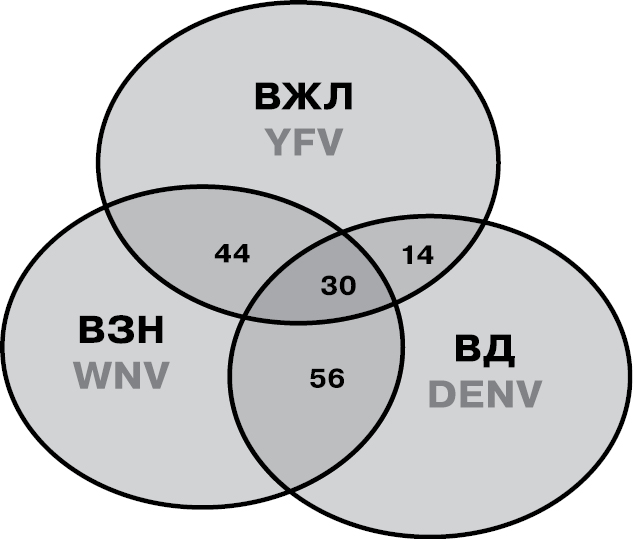 Стоит обратить внимание, что при анализе сывороток крови, были выявлены образцы, в которых детектировались вирусоспецифические антитела IgG ко всем трем флавивирусам или к двум из них. Так, антитела одновременно к трем вирусам (ВЖЛ, ВД и ВЗН) были выявлены в 30 случаях, к ВЖЛ и ВД — 14, ВЖЛ и ВЗН — 44, ВД и ВЗН — 56 (рис. 2).