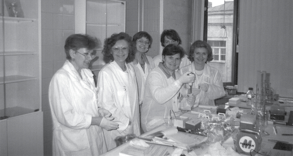 Note. Bottom row, in the middle: T.T. Smolskaya, Head of the Center, Doctor of Medical Sciences, Honored Doctor of the Russian Federation and F.S. Noskov; second row, from left to right: V.G. Eliseeva, V.A. Raiskaya, G.I. Korovina, V.I. Fedotova, M.M. Leontieva, N.A. Gladkova, N.P. Leshchinskaya, T.L. Zatolokina; top row, from left to right: Zh.V. Terentyeva, M.O. Lubkina, E.A. Shilova, E.N. Rushnevskaya, A.V. Zakrevskaya.