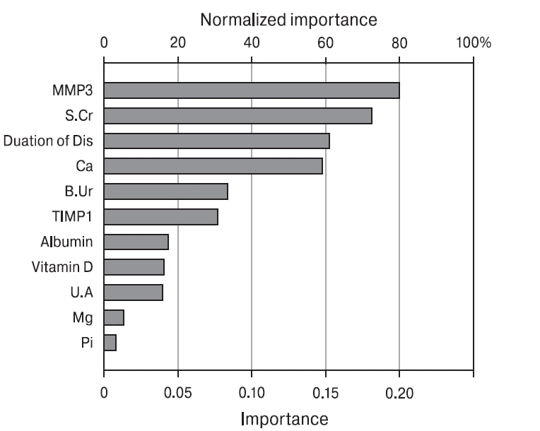 The NN analysis. The other important findings of the present study are the results of NN studies in Table 3. The measured parameters have a moderate sensitivity with excellent specificity for the prediction of HD+CRP versus HD–CRP. Figure 1 shows the top four predicting variables for predicting a high risk of inflammation in HD patients, which are MMP3 followed by creatinine, duration of disease, and total calcium. While NN#2 showed a great sensitivity of the model in predicting HD patients from the control group with the usual biomarkers of HD (urea and creatinine). However, MMP3 and vitamin D also act as possible predictive variables. Various metabolites may generate or be absorbed due to elevated serum urea levels, which probably lead to malnutrition, inflammation, and uremic toxicity [12]. TIMP1 is expressed in human glomeruli and is upregulated in glomerulosclerosis [9]. In clinical studies, patients with diabetic kidney diseases have been shown to have abnormalities in MMP/TIMP modulation. In patients with DKD, increasing glomerular lesions have been associated with reductions in serum TIMP1 and TIMP2 levels and increases in serum and urine TIMP1 levels [35, 42]. The induction of the decrease in serum MMP9 and MMP3 levels is one of the possible mechanisms responsible for the decrease in urea levels [50]. There was a significant positive correlation between the total score of kidney injury molecule 1 (KIM-1) expression and kidney function parameters for AKI, including serum creatinine and blood urea. In addition, strong positive correlations were found between the total score of KIM-1 expression and proximal tubular necrosis and MMP3 expression. The KIM-1 shedding might be stimulated by MMP3 [38].