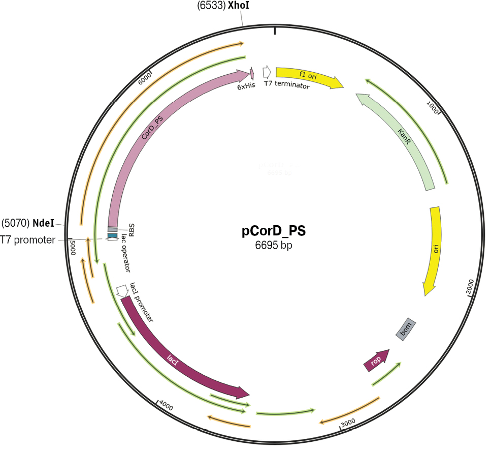 Конструирование плазмиды pCorD_PS. Последовательность гена, кодирующего химерный белок, синтезировали и клонировали в вектор pET24a(+) по сайтам рестрикции: 5' — NdeI, 3' — XhoI. Перед 6×His-меткой дополнительно ввели стоп-кодон. Полученную плазмиду секвенировали на приборе «ABI PRISM 310 GeneticAnalyzer» (Applied Biosystems, США) с использованием набора ABI PRISM BigDye Terminators Cycle Sequencing Kit.