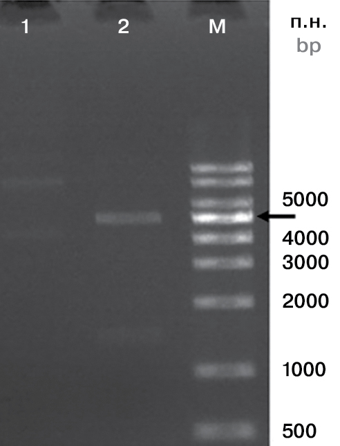Примечание. 1 — pCorD_PS нерестрицированная; 2 — pCorD_PS рестрицированная по сайтам NdeI и XhoI; М — Маркер молекулярного веса ДНК (500–10 000 bp DNA Ladder).