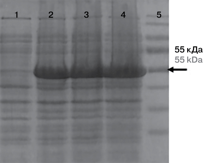 Экспрессию белка в культурах 3 клонов, индуцированную добавлением 1 мМ ИПТГ, проанализировали в 12% полиакриламидном геле. Во всех проанализированных клонах после 4 ч индукции обнаружили экспрессию белка, масса которого соответствует теоретически ожидаемой в 53 kDa (рис. 5). Для дальнейшей работы мы выбрали клон № 3.