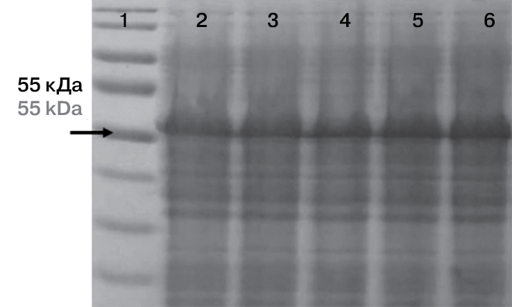 Примечание. 1 — смесь маркерных белков для электрофореза (Thermo Scientific, кат. ном. 26616), 2 — лизат индукции после 1 пассажа; 3 — лизат индукции после 3 пассажа; 4 — лизат индукции после 5 пассажа; 5 — лизат индукции после 7 пассажа; 6 — лизат индукции после 9 пассажа.