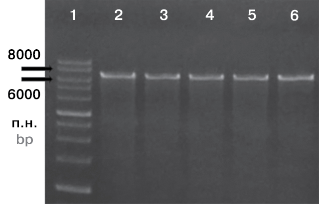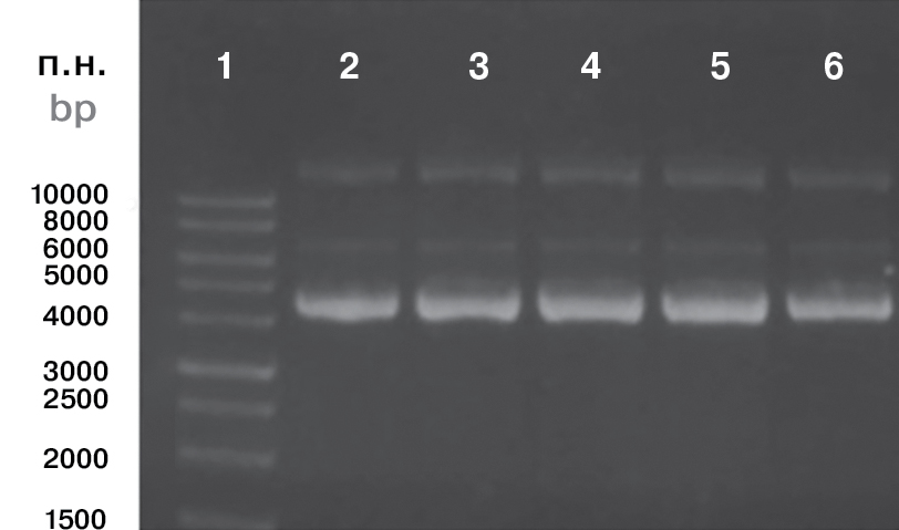 Примечание. 1 — смесь маркерных фрагментов ДНК 1 kb DNA Ladder (Евроген, кат. ном. NL001); 2 — плазмида, выделенная из 1 пассажа; 3 — плазмида, выделенная из 3 пассажа; 4 — плазмида, выделенная из 5 пассажа; 5 — плазмида, выделенная из 7 пассажа; 6 — плазмида, выделенная из 9 пассажа.