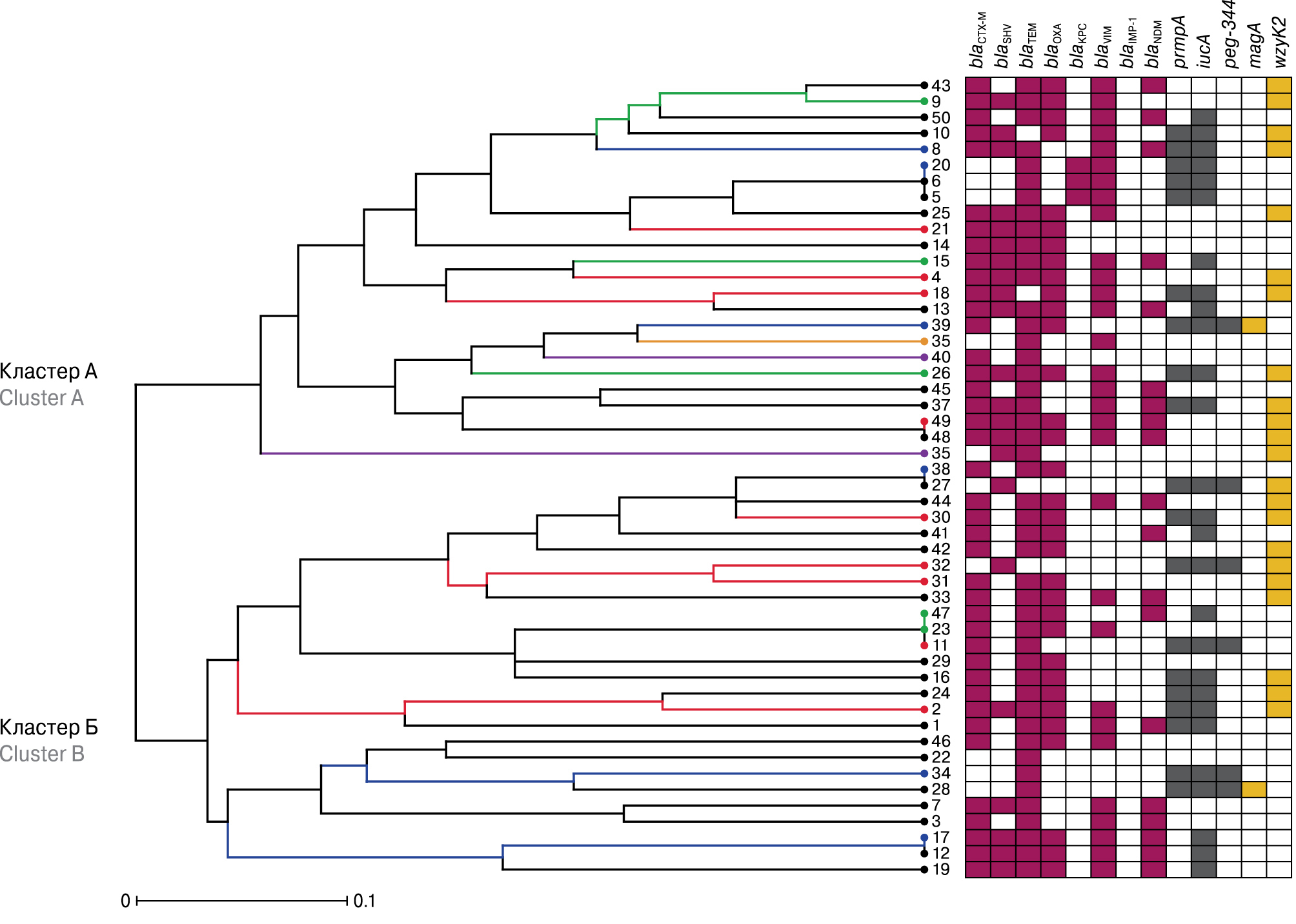 Сравнение чувствительность к антибактериальным препаратам изолятов двух кластеров не выявило существенного различия между ними, при этом культуры, содержащие blaKPC встречались только в кластере А, и достоверно чаще в этой группе встречались гены blaVIM-2 (р = 0,016; F-тест) и blaSHV (р = 0,004; F-тест). Шанс встретить изоляты с гипервирулентным генотипом (prmpA+iucA+peg-344), напротив, был в 4 раза выше в кластере Б.