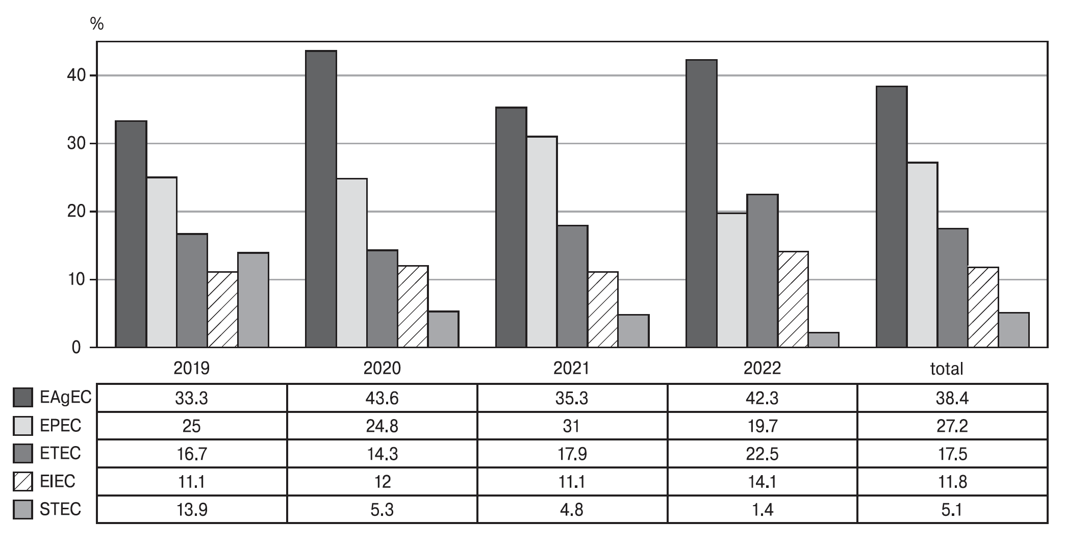 Genetic markers of DEC were detected in faecal samples of patients of all age groups in all years of study (Table 1). For the period from 2019 to 2022, the total percentage of E. coli infections in the etiological structure of acute intestinal infections amounted to 51.7% (a range from 32.5% to 58.3%). In the age structure, DEC was significantly more common in young children aged 0–5 (96.9%, p < 0.05) compared to the group of school age children aged 6–17 (53.9%) and adults (45.6%).