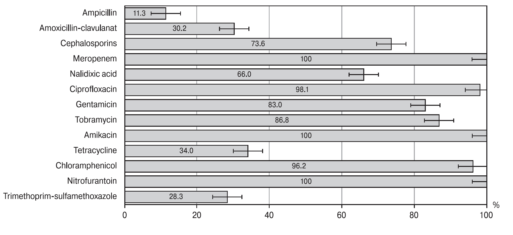 A study of the susceptibility of DEC strains to antibiotics in the Guinean population showed that 100% of the strains were susceptible to meropenem, amikacin, and nitrofurantoin. The activity of other antibiotics ranged from 11.3% for ampicillin, 28.3% for trimethoprim-sulfamethoxazole, and 34.0% for tetracycline up to 73.6% for cephalosporins, 84.0% for aminoglycosides, and 98.1% for fluorinated quinolones.