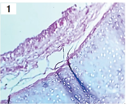 Рисунок 1. Микроскопическая картина некротических изменений слизистой оболочки трахеи с дегенерацией и десквамацией эпителиальных клеток, выраженным отеком, мононуклеарной инфильтрацией подслизистого слоя. Окраска гематоксилином и эозином (×900) / Figure 1. Microscopic picture of necrotic changes in the tracheal mucosa with epithelial cell degeneration and desquamation, severe edema. Stained with hematoxylin and eosin, ×900