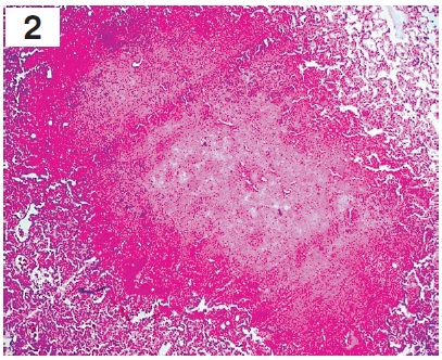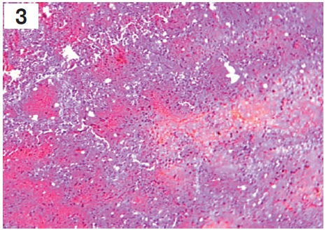 В легких были выявлены признаки двусторонней тотальной геморрагической пневмонии. При макроскопическом исследовании: легкие с двух сторон плотной консистенции, тяжелые, безвоздушные, отечные, синюшного цвета. При гистологическом исследовании определялись неравномерно расправленные альвеолы с утолщенными межальвеолярными перегородками за счет отека и полнокровия, признаки пролиферации эндотелиоцитов капилляров, десквамация альвеолярного эпителия, отек, мононуклеарная инфильтрация, в альвеолах и альвеолярных ходах наблюдались гиалиновые мембраны. Также выявлялись участки некроза альвеолярного эпителия с обнажением базальной мембраны и признаками выраженного отека с геморрагическим компонентом, в просвете альвеол встречались гемолизированные эритроциты, гемосидерин, гемосидерофаги. Визуализировались очаговые кровоизлияния в легочной паренхиме, местами сливающиеся, с выходом форменных элементов крови в просвет альвеол и участки некроза легочной ткани с формированием «гнойников» (микроабсцессов), в зонах некроза встречались микробные колонии. В окружности участка некроза отмечался хорошо выраженный вал из зернистых лейкоцитов. В альвеолах, расположенных ближе к гнойникам, определялся фибринозный и серозный экссудат (рис. 2 и 3, вклейка, с. II).