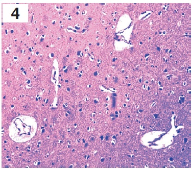 В головном мозге наблюдались признаки отека, что гистологически указывало на наличие выраженных периваскулярных, перицеллюлярных оптических пустот с полнокровием сосудов, эритроцитарными сладжами и мелкими кровоизлияниями (рис. 4, вклейка, с. II).