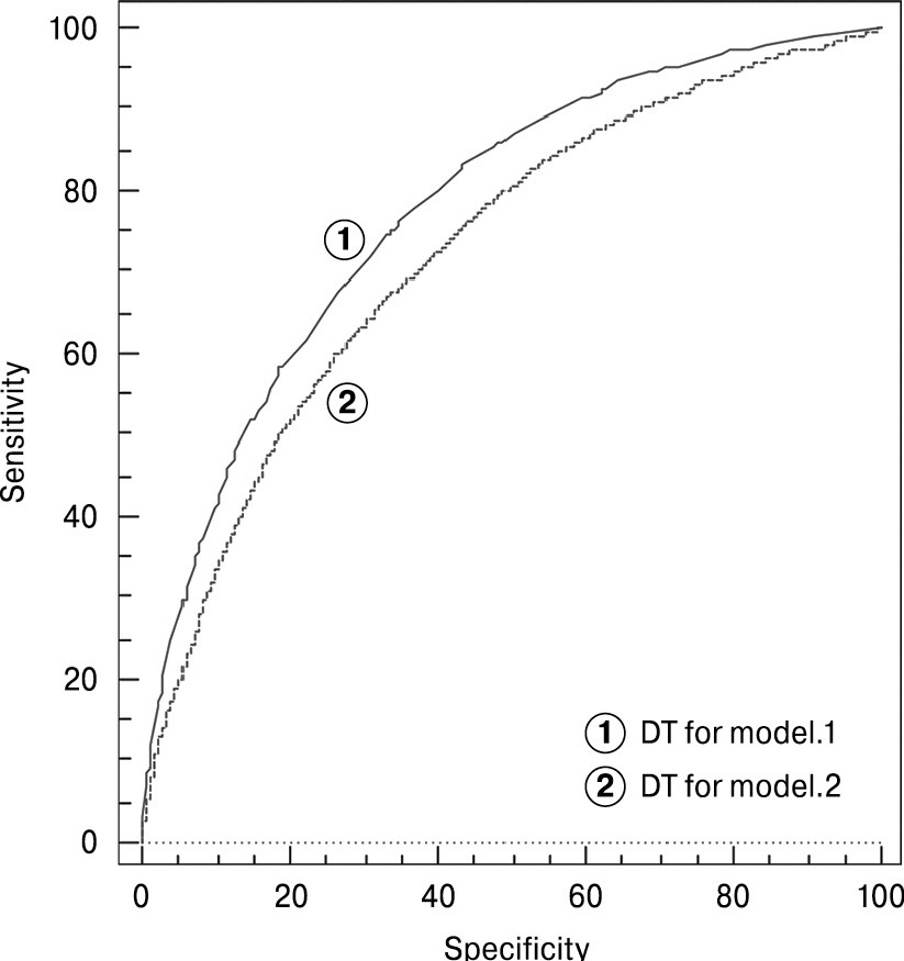 Fig. 2 showed the accuracy, ROC curve, sensitivity, specificity values for predicting VDD in training set. The areas under the ROC curves is (0.78), When we applied DT algorithm with the significant variables by cross validation, the values of 0.78 ROC and 85.3% accuracy were obtained, which is similar to the obtained results of applying training and test sets one by one.