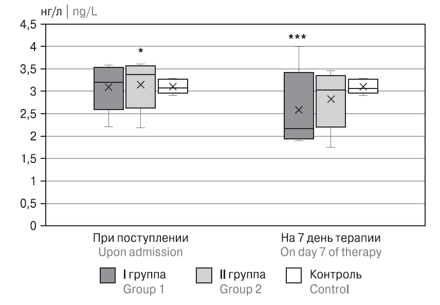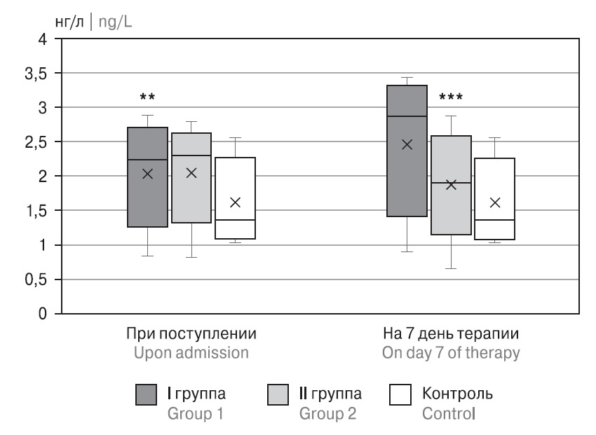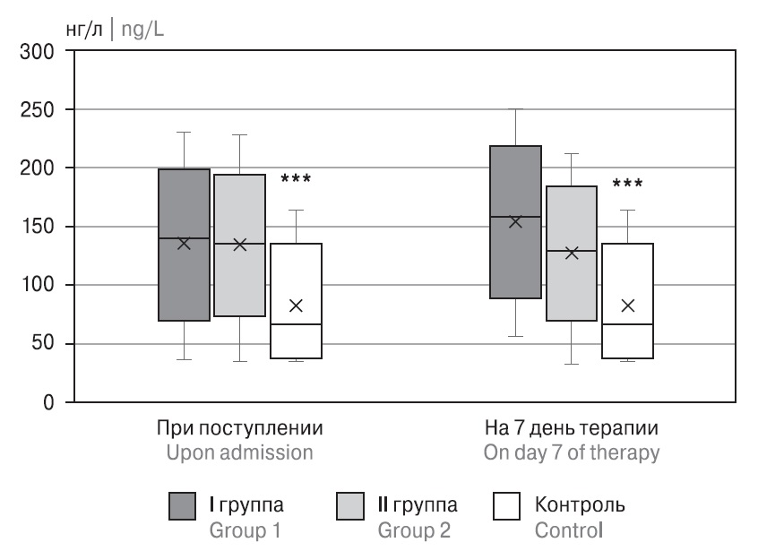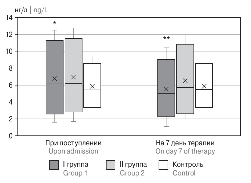 Уровень TIMP-2 у пациентов обеих групп при поступлении также был выше референсных величин. На 7-е сутки терапии данный показатель снижался в обеих группах и достигал уровня контрольных значений (рис. 4).