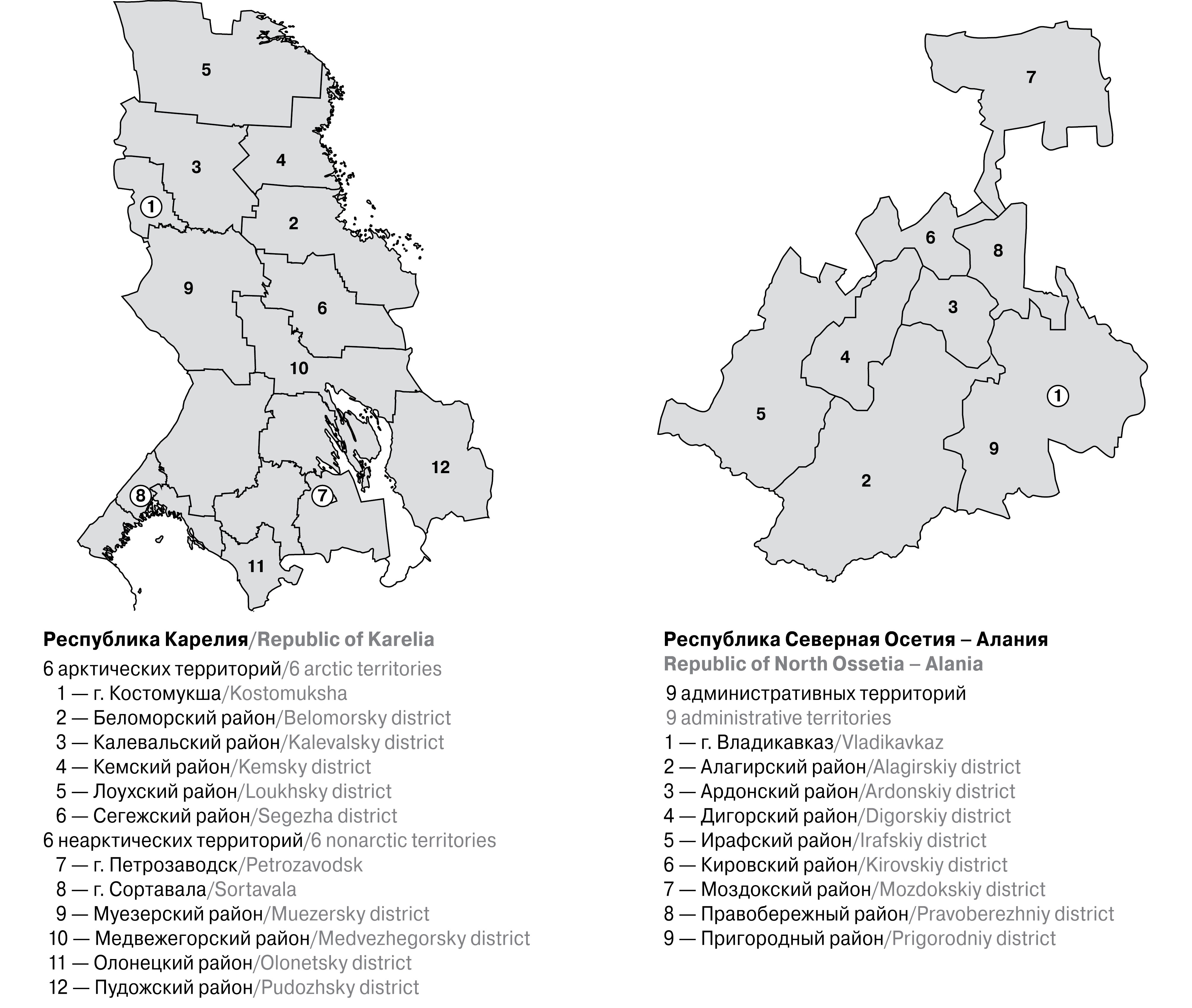 Figure 2. Territories of the Republic of Karelia and the Republic of North Ossetia-Alania included in the study