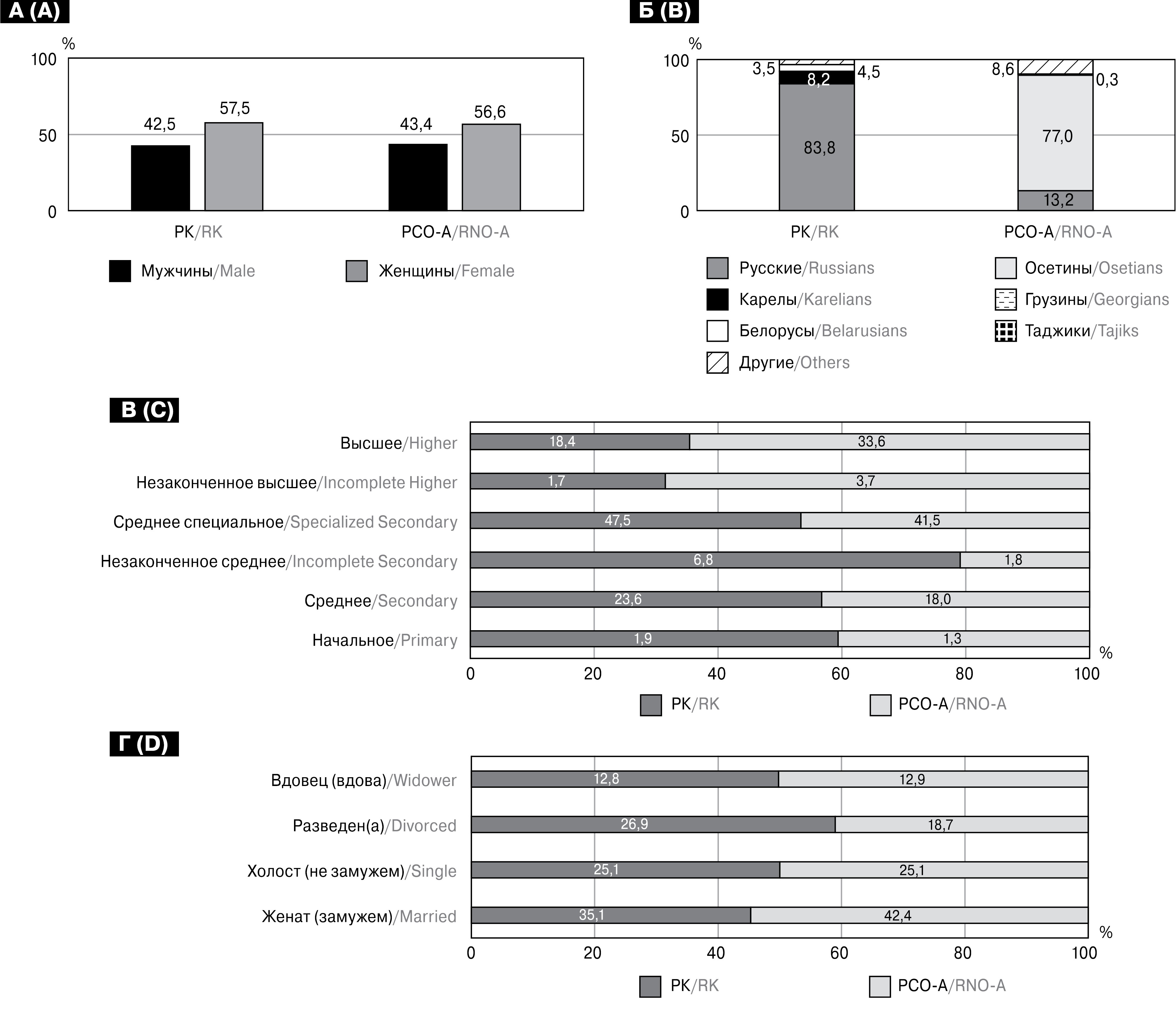 Этнически в РК преобладало русскоязычное население (83,8%), в РСО-Алания — осетины (77,0%, p < 0,000); другие национальности составили от 8,2% карелов в РК до 0,3% таджиков в РСО-Алания (рис. 3Б). По уровню образования в том и другом регионе большинство (более 40,0%) составили лица со среднеспециальным образованием (рис. 3В). Тем не менее в РСО-Алания респонденты достоверно чаще, чем в РК, имели высшее образование (33,6% против 18,4%, p < 0,000), соответственно в РК было больше лиц с начальным, средним, и незаконченным средним образованием, нежели в РСО-Алания (32,3% против 21,1%). Доля лиц с незаконченным высшим образованием в регионах была незначительной: 1,7% в РК, 3,7% в РСО-Алания. По семейному положению больше было женатых (замужних) респондентов как в РК (35,1%), так и в РСО-Алания (42,4%), однако в РК доля разведенных достоверно преобладала над таковой в РСО-Алания (26,9% против 18,7%, p < 0,022) (рис. 3Г). В целом доля одиноких респондентов, за исключением разведенных, в обоих регионах была почти равнозначной, составив в РК 37,9%, в РСО-Алания — 38,0%.