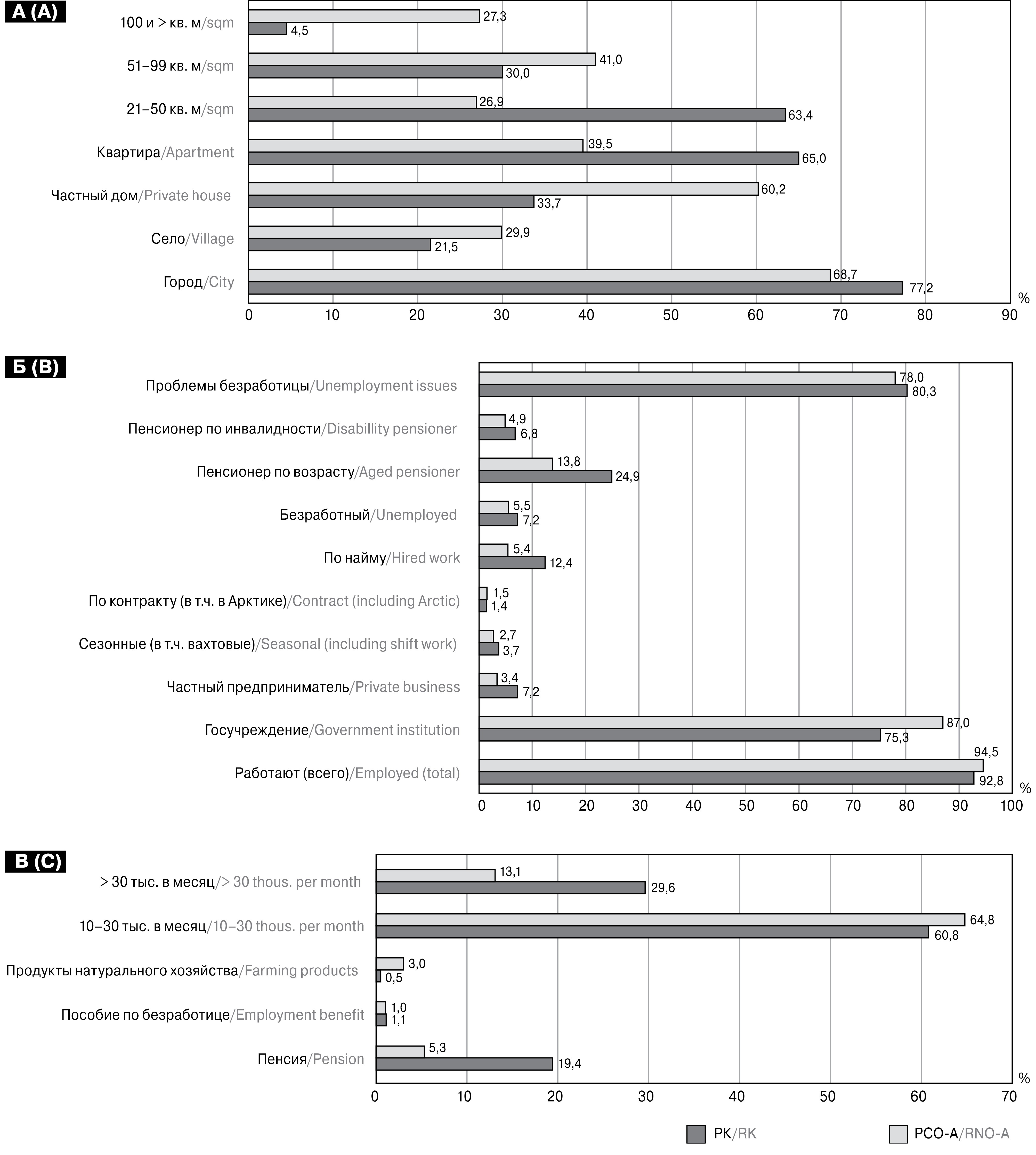 Рисунок 4. Социально-экономические факторы риска: 4А — место и условия проживания, 4Б — наличие и вид работы, 4В — доходы