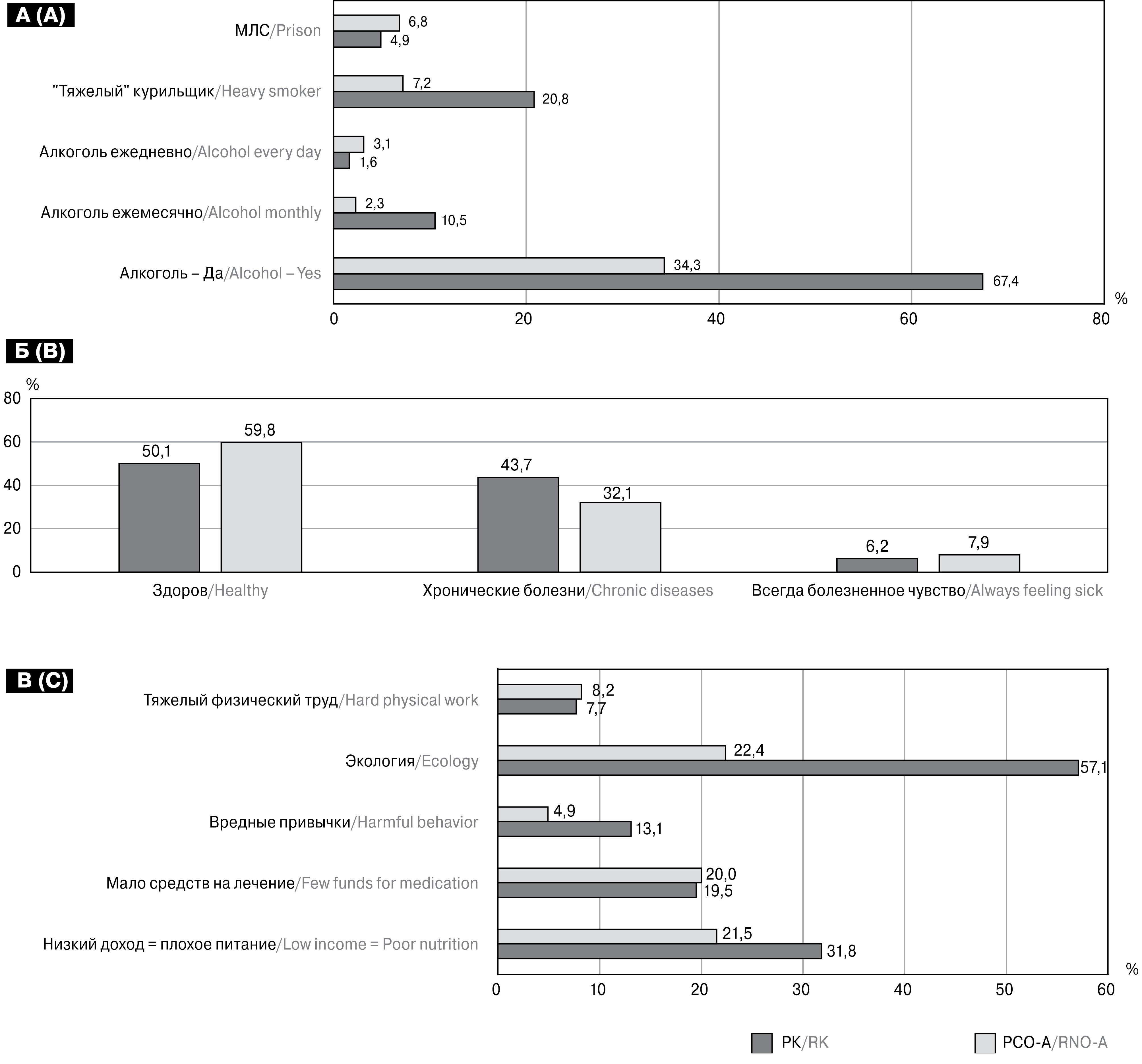 Figure 5. Behavioral and medico-social risk factors: 5A — bad habits and problems with legal authorities, 5B — health self-assessment, 5C — causes of poor health