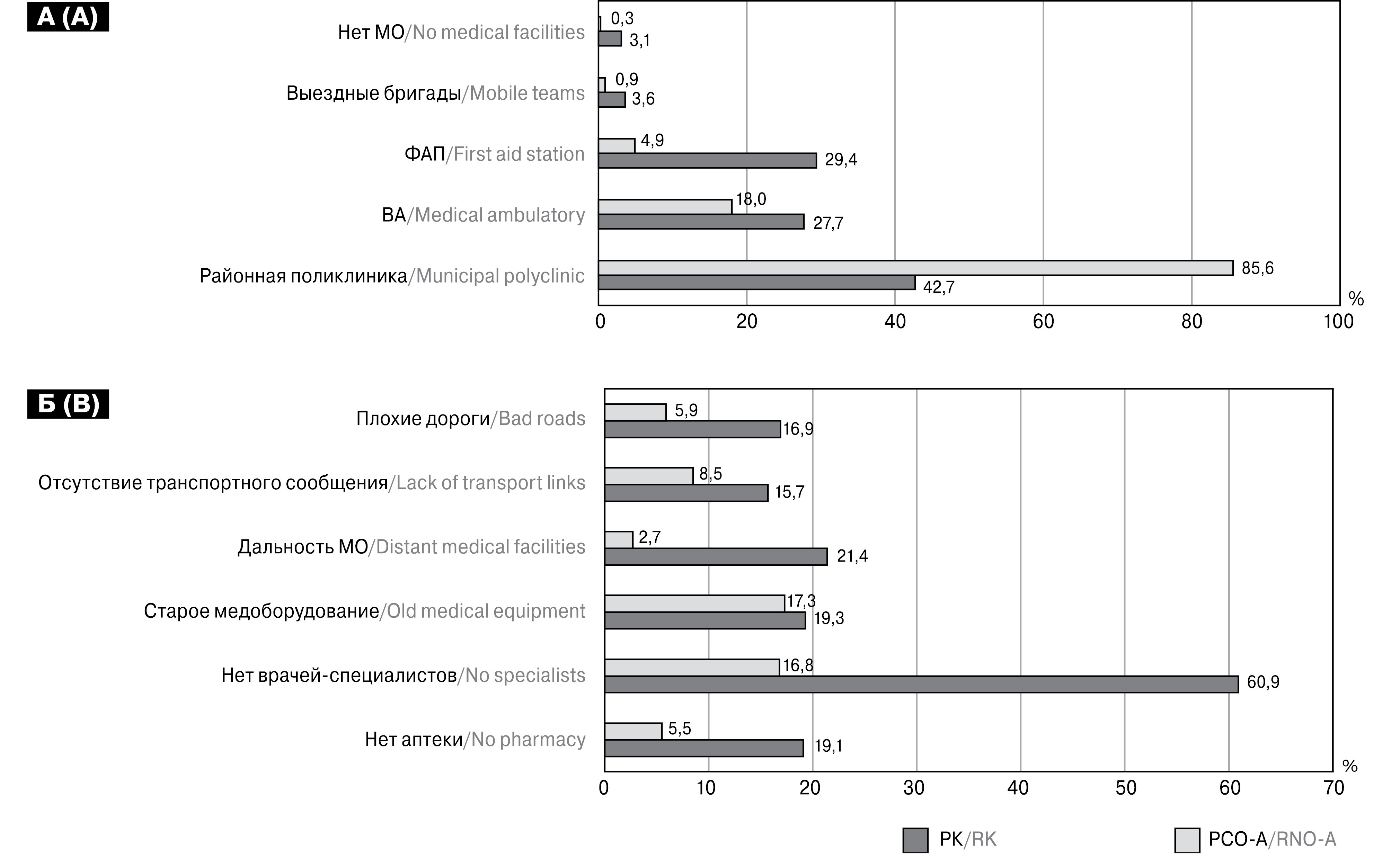 При оценке доступности медицинской помощи населению на уровне первичной медико-санитарной помощи в РК, по отношению к РСО-Алания, в 1,5 раза преобладало оказание помощи врачебными амбулаториями (ВА), в 6 раз — фельдшерско-акушерскими пунктами (ФАП) и в 4 раза — выездными бригадами специалистов (p < 0,000) (рис. 6А). Также в РК доля респондентов, указавших на отсутствие МО на территории своего проживания, была достоверно выше, чем в РСО-Алания (3,1% против 0,3%, p < 0,000). В РСО-Алания, напротив, в два раза чаще, чем в РК, медицинская помощь населению оказывалась районными поликлиниками (85,6% против 42,7%, p < 0,000).