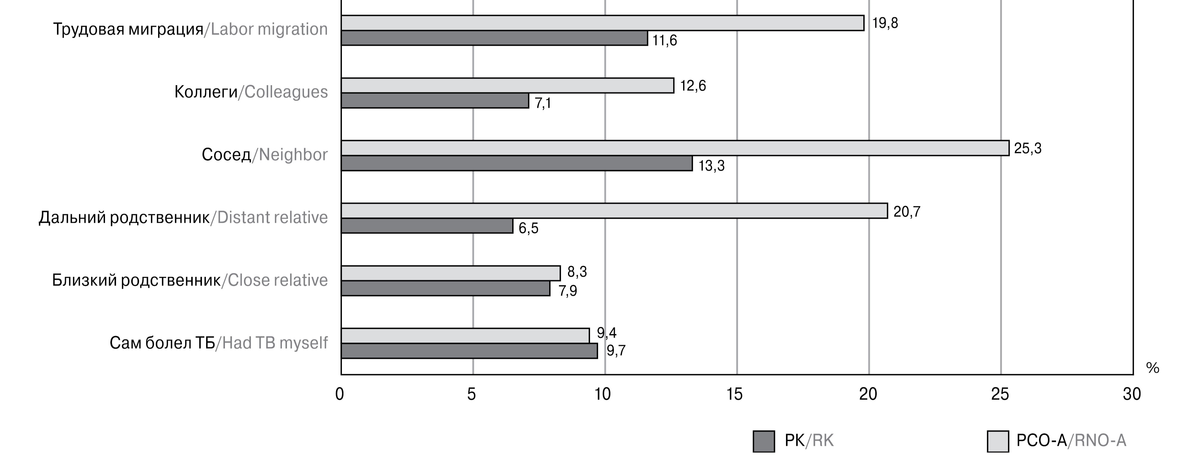 К эпидемиологическим факторам риска мы отнесли ответы респондентов на вопрос «Знаете ли Вы что такое туберкулез?», косвенно отражающие уровень или частоту тубконтактов в окружении респондента (рис. 7). В РСО-Алания около 70,0% респондентов указали на то, что их близкий и дальний родственник, также сосед и коллега болели ТБ, тогда как в РК доля таковых составила чуть более 1/3 части участников (p < 0,000). В РК анкетируемые также меньше, чем в РСО-Алания придали значение трудовой миграции как источнику распространения инфекционных заболеваний. Доля перенесших самим ТБ в том и другом регионе была почти равной, составив в РК 9,7%, РСО-Алания — 9,4%.