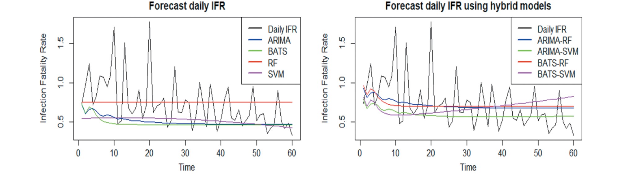 To sum up, we have studied the behavior of daily IFR of COVID-19 using statistical models and machine learning models, we have fitted the values of daily IFR which help us to understand the phenomena. To improve the forecasting results we have put into practice hybrid models such as ARIMA-SVM, BATS-SVM, ARIMA-RF and BATS-RF, basing on performance measures ARIMA-RF is the best model.