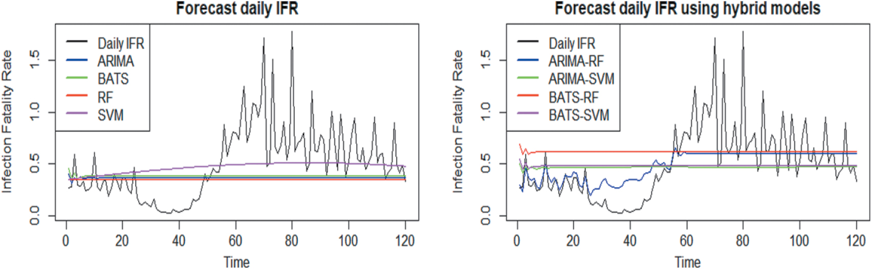 The main goal of this paper is to delve into a crucial epidemiological metric the daily infection fatality rate in the context of the ongoing COVID-19 pandemic. The significance of understanding this metric lies in its potential to provide insights into the severity and impact of the virus on a daily basis. Methods: To achieve this overarching objective, we employ a comprehensive approach by applying various hybrid models that hybridize both machine learning and statistical techniques. In our pursuit of a deeper understanding, we leverage advanced machine learning algorithms, including Support Vector Machine and Random Forest. These techniques allow us to capture intricate patterns and relationships within the data, contributing to a more nuanced analysis of the infection fatality rate. The application of machine-learning models in epidemiological studies has gained prominence due to their ability to adapt to complex and evolving patterns inherent in infectious disease dynamics. Complementing our machine-learning arsenal, we integrate traditional statistical models such as ARIMA (AutoRegressive Integrated Moving Average), fractional ARIMA, and BATS (Bayesian Structural Time Series). Results. To assess the performance of these models, we employ key evaluation metrics, including Root Mean Squared Error (RMSE), Mean Squared Error (MSE), and Mean Absolute Error (MAE). These metrics serve as critical benchmarks, allowing us to quantify the accuracy and reliability of our models in predicting the daily infection fatality rate. A meticulous evaluation of model performance is crucial for ensuring the validity and of our findings. According to these measures, we see that hybrid models performed well especially ARIMA-RF model RMSE: 0.29, MSE: 0.084, MAE: 0.215 for the horizon 60 and for horizon 120 ARIMA-RF still the best performance, RMSE: 0.268, MSE: 0.071, MAE: 0.183, we get these results due to the capacity of this approach to handle complex patterns contrarily to other model ARIMA, BATS, RF and SVM. Conclusion. This work adopted this approach in order to build a model to predict infection fatality rate, we aspire to provide a nuanced understanding of the factors influencing the severity of the virus, ultimately contributing to the ongoing discourse on effective public health interventions and mitigation strategies.
