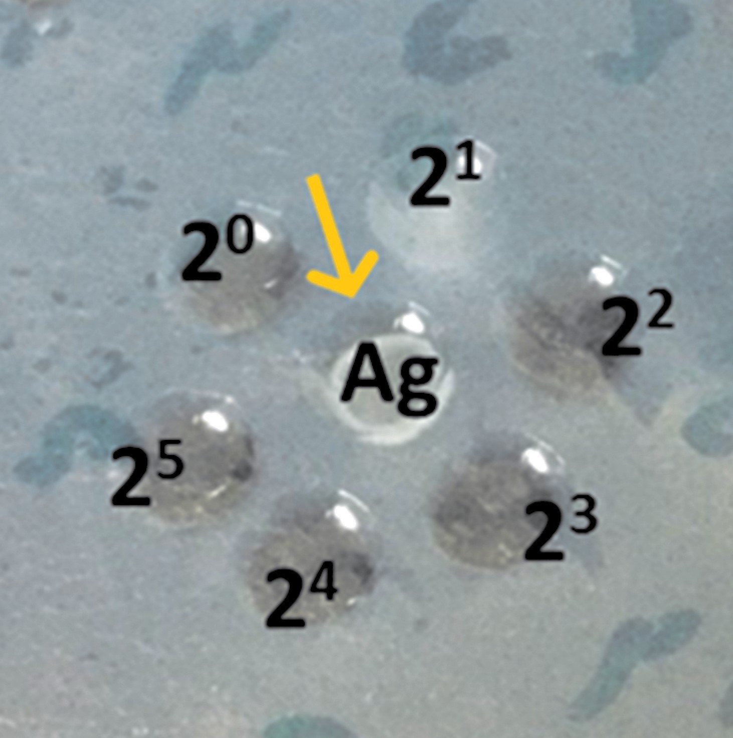 Figure. Positive reactions are indicated by the presence of a white precipitation line between the antigen (Ag, rabies virus) and antibody (serum at dilution 21) (arrow)