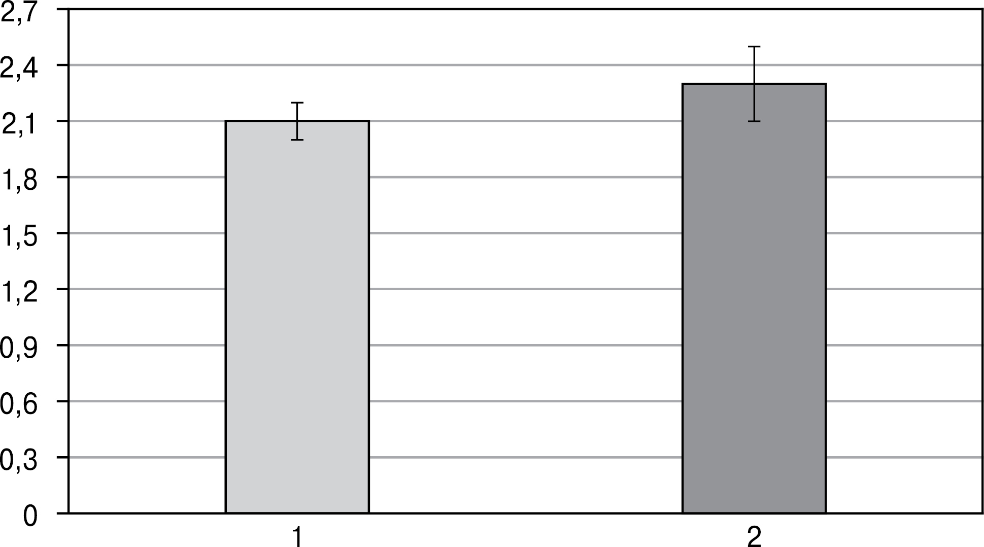 Рисунок. Соотношение количества нейтрофилов к количеству лимфоцитов крови у пациентов с ИБС после 3–4 недель заболевания новой коронавирусной инфекцией. Примечание. На оси абсцисс представлены сравниваемые когорты пациентов, на оси ординат — величина соотношения количества нейтрофилов к количеству лимфоцитов; 1 — пациенты контрольной группы, 2 — пациенты основной группы.