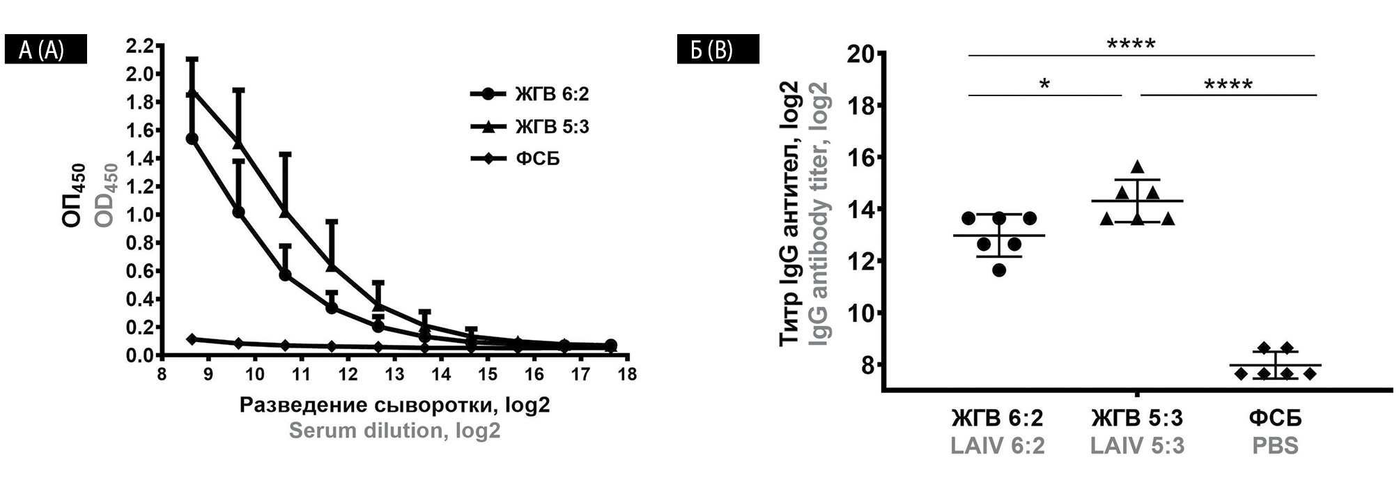 Рисунок 1. Выявление вирусспецифических IgG-антител в сыворотках крови мышей, иммунизированных двукратно вакцинными штаммами ЖГВ 6:2 и ЖГВ 5:3. Примечания. Уровни антител выявлялись в иммуноферментном анализе с использованием цельного вируса A/Гуандун-Маонань/SWL1536/2019 (H1N1). А. Средние значения оптической плотности в лунках при каждом разведении сывороток. Б. Значения титров антител в каждой исследуемой группе. Сравнение данных проводилось с использованием дисперсионного анализа ANOVA с поправкой Тьюки (*p < 0,05; ****р < 0,0001).