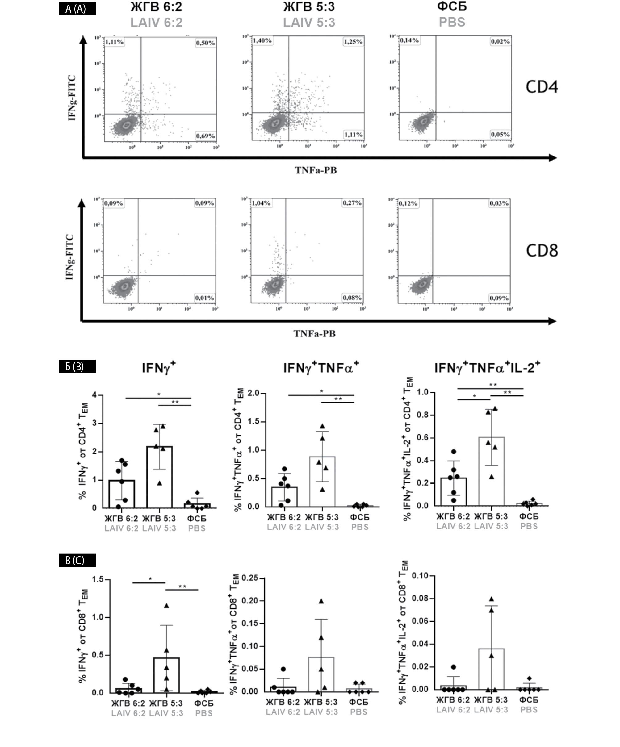 Рисунок 2. Индукция системного Т-клеточного ответа в ответ на иммунизацию вакцинными штаммами ЖГВ 6:2 и ЖГВ 5:3. Примечания. А. Репрезентативные дот-плот графики данных проточной цитометрии спленоцитов мышей после стимуляции цельным вирусом H1N1/wt. Б. Уровни цитокин-продуцирующих CD4+ Т-клеток среди популяции эффекторной памяти (CD44+СD62L). В. Уровни цитокин-продуцирующих CD8+ Т-клеток среди популяции эффекторной памяти (CD44+СD62L). Представлены субпопуляции ТЕМ, продуцирующие IFNγ (слева), IFNγ и TNFα (посередине), и IFNγ, TNFα и IL-2 (справа) в ответ на двукратную вакцинацию. * р < 0,05, ** р < 0,01.