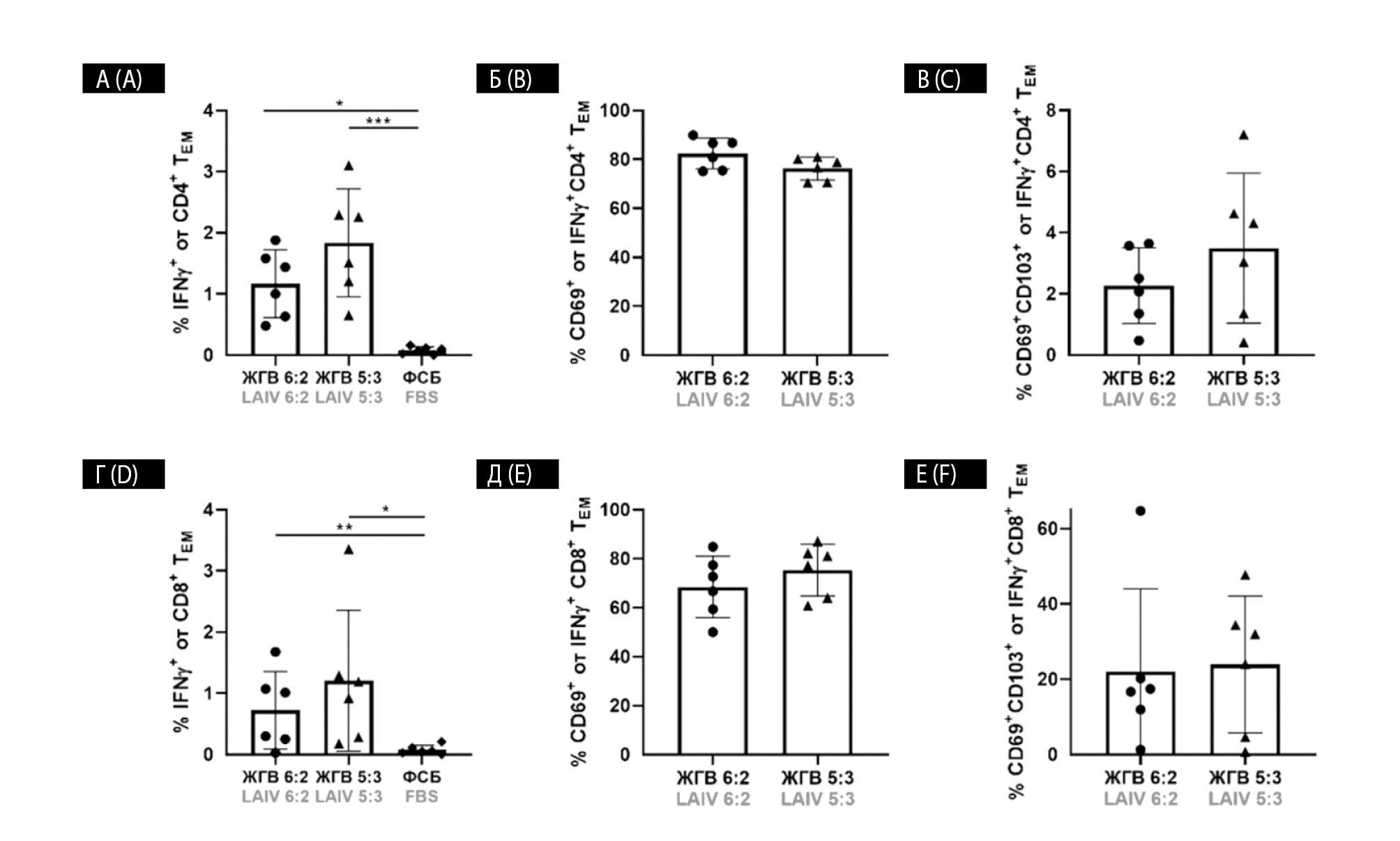 Соответственно, на 7-е сутки после двукратной иммунизации вакцинными штаммами ЖГВ H1N1 6:2 и ЖГВ H1N1 5:3 у мышей выделяли клетки из тканей легких и стимулировали цельным вирусом H1N1/wt с последующим выявлением вирусспецифических (то есть IFNγ+) Т-клеток эффекторной памяти (CD44+CD62L), экспрессирующих маркеры тканерезидентности (CD69+CD103+). Было показано, что ТЕМ клетки мышей, иммунизированных штаммом ЖГВ 5:3, имеют тенденцию к экспрессии более высоких уровней IFNγ в ответ на стимуляцию цельным вирусом H1N1/wt, по сравнению с группой ЖГВ 6:2, что говорит о большей интенсивности клеточного ответа после иммунизации модифицированной вакциной (рис. 3А, Г). Эти данные указывают на более выраженную индукцию вирусспецифических Т-клеток памяти, локализующихся в легких мышей, при иммунизации вакцинным прототипом ЖГВ 5:3, по сравнению с классическим вариантом ЖГВ 6:2. Среди интерферон-продуцирующих Т-клеток эффекторной памяти более 70% экспрессировали маркер СD69 (рис. 3Б, Д). Кроме того, значительное количество CD8+CD69+ TEM клеток несли маркер CD103+, свидетельствующий о локализации данных клеток в барьерных тканях, в непосредственной близости от потенциального места проникновения патогена (рис. 3Е).