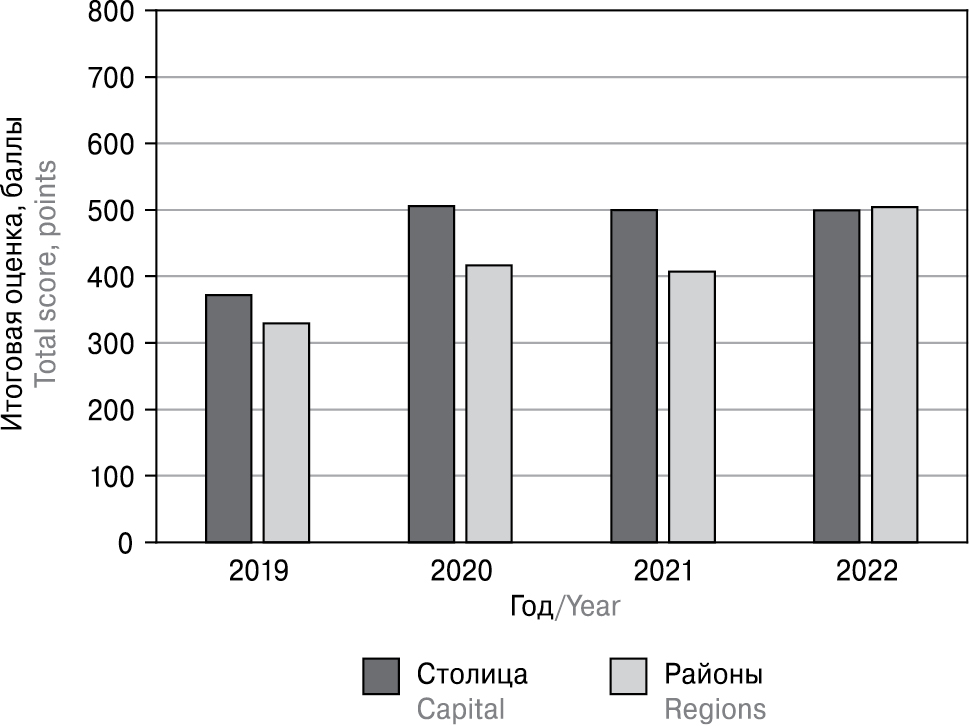 Анализ результатов в зависимости от расположения стационаров показал, что в период времени с 2019 по 2021 г. исследуемый показатель в столичных стационарах был выше, чем в региональных (рис. 1). Однако благодаря проведенной учебно-методической работе в 2022 г. оценки практически сравнялись.
