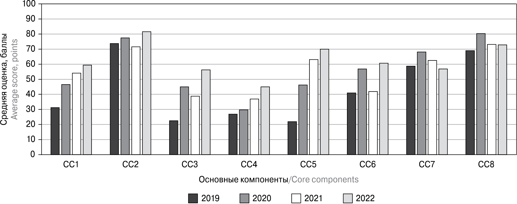 Средняя суммарная оценка по основному компоненту 2 в течение анализируемого периода времени выросла в 1,11 раз (с 73,8 до 81,6 баллов). Это обусловлено тем, что изначально оценка была достаточно высока, показывая максимальную среднюю суммарную оценку среди всех основных компонентов в 2019 г. (рис. 2). Кроме того, это был единственный основной компонент программы ПИИК, средняя суммарная оценка по которому, будучи максимальной в 2022 г., превысила порог в 80%.