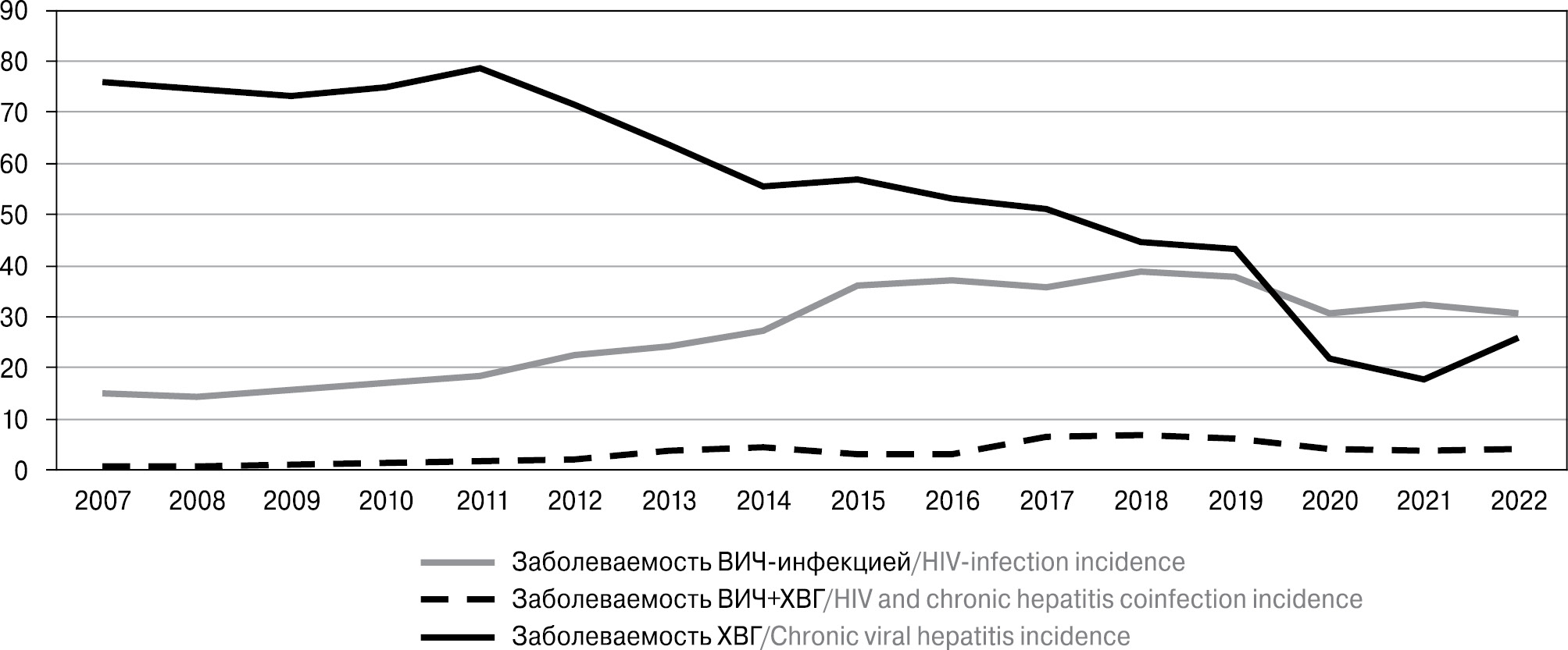 При сопоставлении полученных нами данных с результатами исследования, проведенного в Приволжском федеральном округе, где оценка распространенности микст-инфекции ВИЧ+ХВГ проведена на примере Пермского края, выявлены различия. Авторы исследования отмечали, что в период с 1996 по 2011 гг. динамика заболеваемости микст-инфекцией ВИЧ+ХГС значительно варьировала: в 2001 г. был зарегистрирован ее пик (51,9 на 100 тыс. населения), после чего на протяжении последующих трех лет (до 2004 г.) регистрировался ее спад с последующим ростом, начиная с 2005 г., а наибольшие значения были отмечены в 2011 г. (67,0 на 100 тыс. населения). Многолетняя заболеваемость ВИЧ-инфекцией, сочетанной с хроническим вирусным гепатитом В, была представлена монотонной кривой, а средний уровень заболеваемости составил всего 0,2 случая на 100 тыс. населения [26]. За смежный промежуток времени в ДФО также регистрировался планомерный рост заболеваемости ВИЧ-инфекцией, сочетанной с ХВГ, но с меньшими, чем в Пермском крае, показателями: с 0,72 случаев на 100 тыс. населения в 2007 г. до 1,93 случаев на 100 тыс. населения в 2011 г.