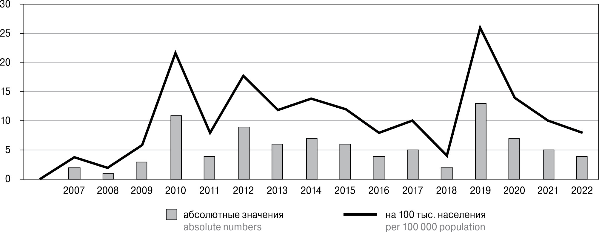 В ЧАО динамика заболеваемости ВИЧ-инфекцией, сочетанной с ХВГ, была крайне изменчива (рис. 3), что связано с небольшой численностью населения региона. В связи с этим даже единичные случаи регистрации инфекционного заболевания обуславливают высокие уровни заболеваемости сочетанным инфицированием ВИЧ-инфекцией и ХВГ в ЧАО.
