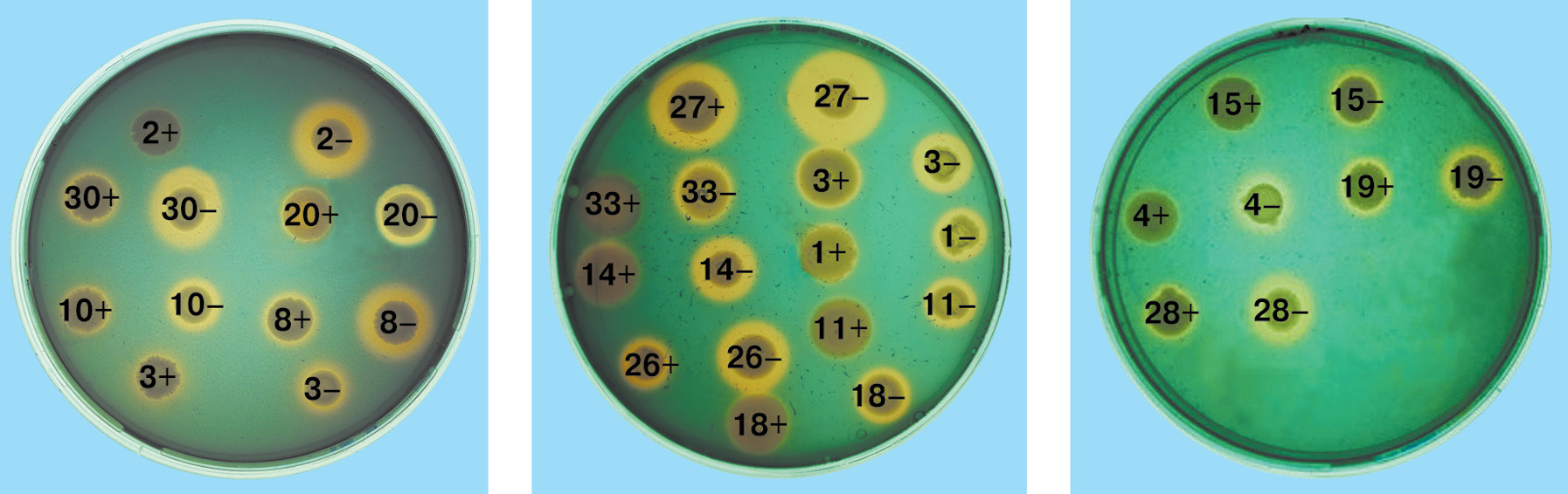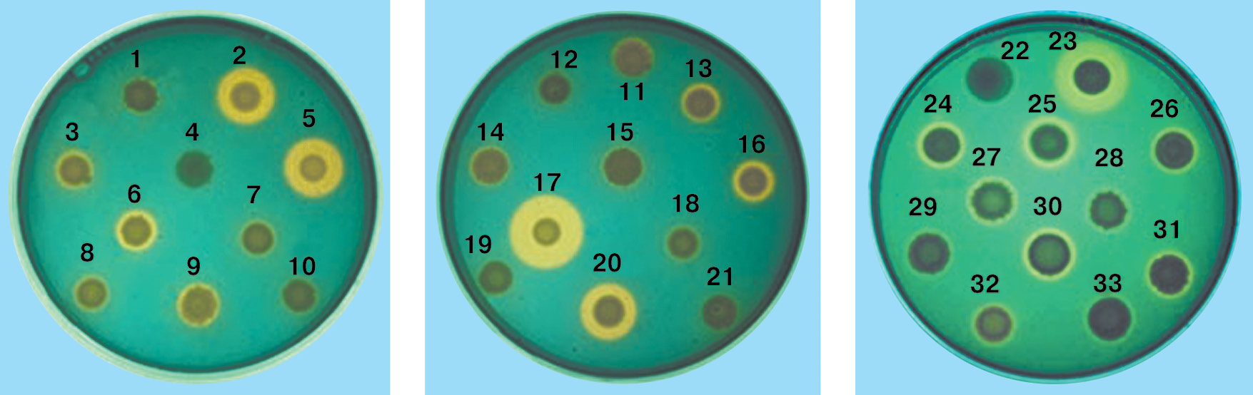 5. Figure 4. Siderophore activity of clones differing in colony morphology (strain number corresponds to the number in Tables 1–3)