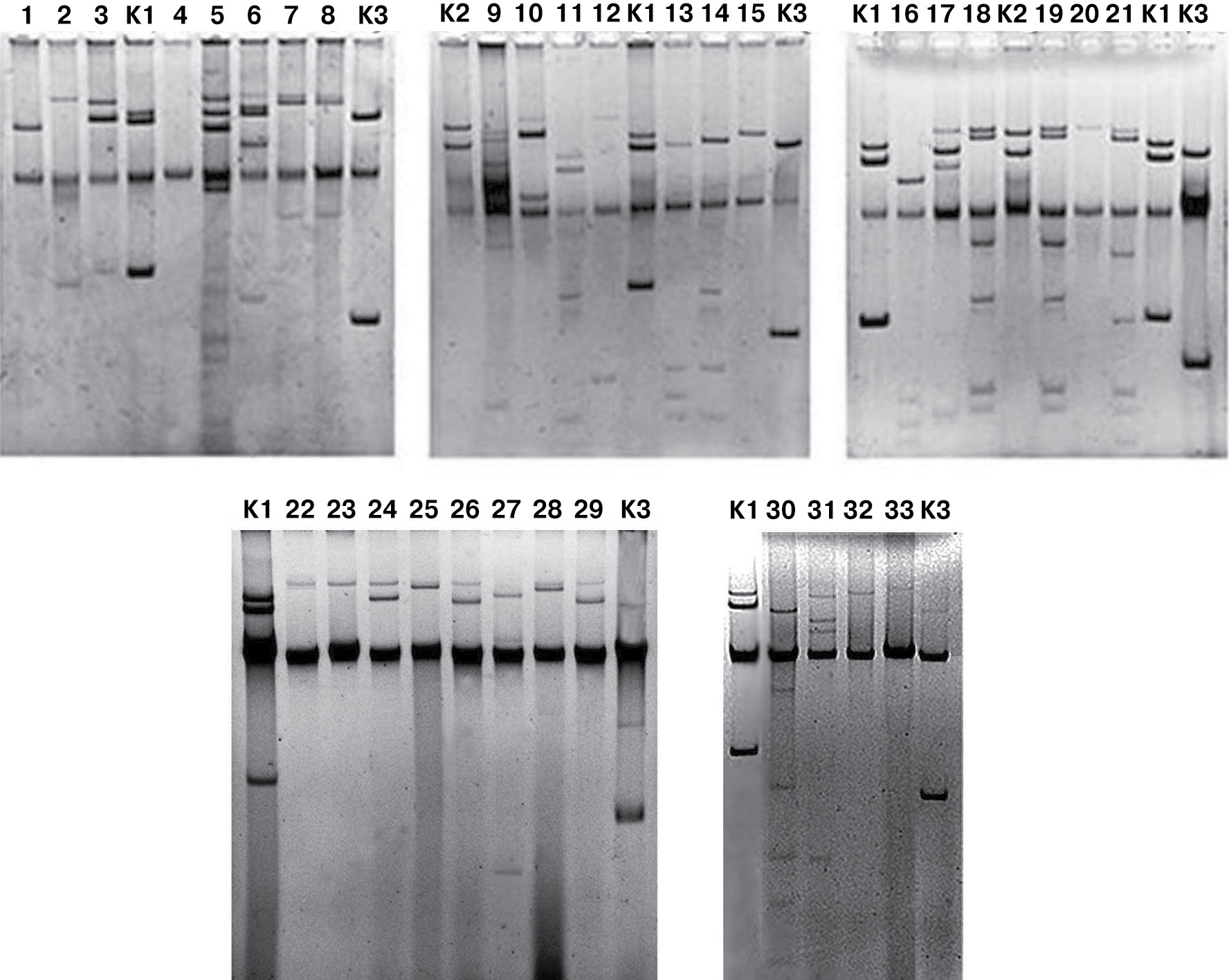 3. Figure 2. Electrophoregram in 0.7% agarose gel of total cellular DNA of K. pneumoniae strains. Controls: K1 — plasmids 96.2–70.3–9.6 kbp; K2 — plasmids 153.1–70.2 kbp.; K3 — plasmids 70.2–6.4 kbp.