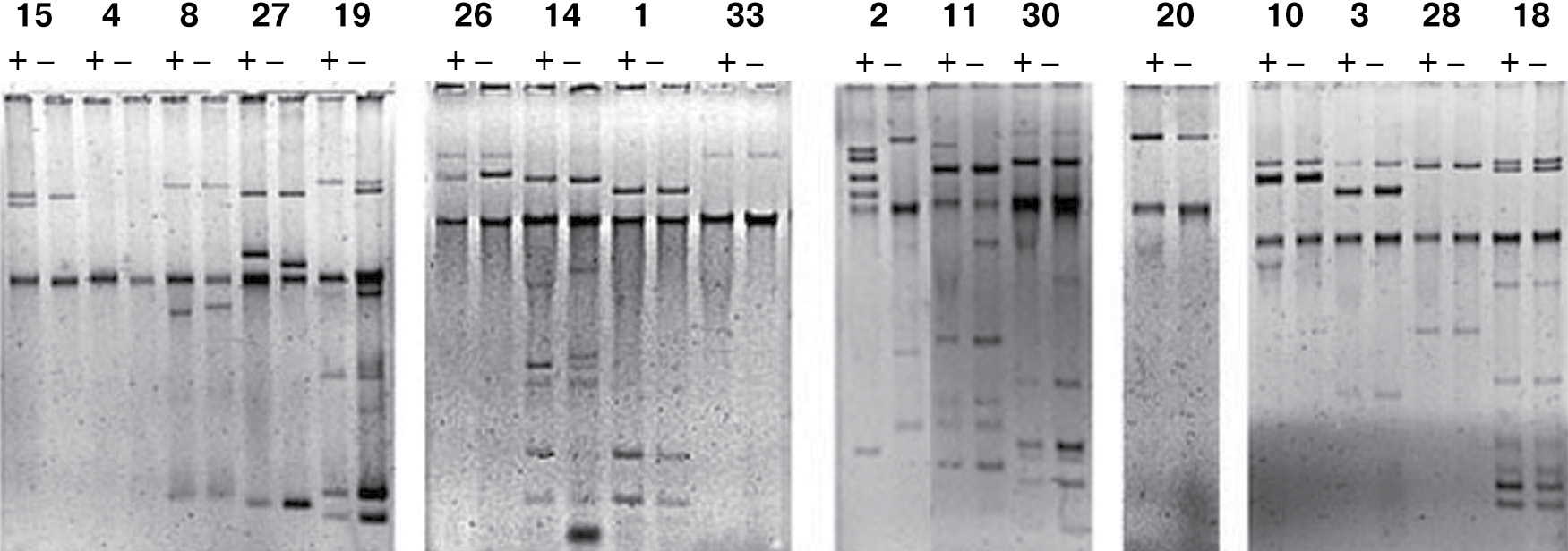 6. Figure 5. Electrophoregram of total cellular DNA of dark («+») and light («–») K. pneumoniae clones strains in 0.7% agarose gel