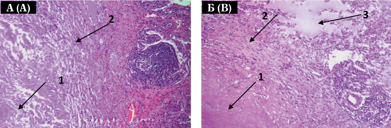 Рисунок 1. Микроскопическая картина туберкулемы легких. Примечание. А — стабильная туберкулема легких: 1) очаг казеозного некроза; 2) соединительнотканная капсула; Б — прогрессирующая туберкулема легких: 1) очаг казеозного некроза; 2) соединительнотканная капсула; 3) серозный экссудат в альвеолах. Окраска гематоксилин-эозин. Микроскоп Сarl Zeiss Primo Star. Увеличение ×400.