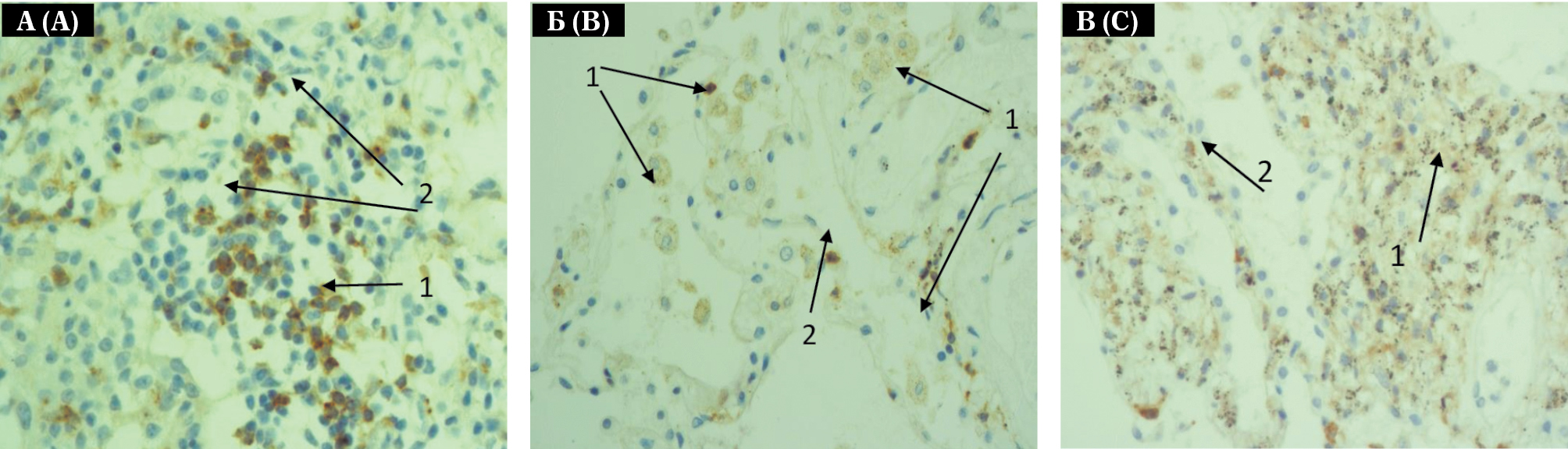 Рисунок 3. Иммуногистохимическое исследование CD4+-клеток в прогрессирующей туберкулеме. Примечание. А — образование групповых очагов скопления CD4+ клеток в капсуле прогрессирующей туберкулемы. Б — увеличение числа внутриальвеолярных макрофагов. Увеличение ×400 (1 — макрофаги, 2 — лимфоциты). В — увеличение числа интерстициальных макрофагов. Микроскоп Сarl Zeiss Primo Star. Увеличение ×400.