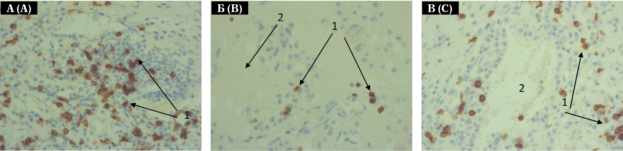 Рисунок 4. Иммуногистохимическое исследование CD8+-клеток в прогрессирующей туберкулеме. Примечание. А — образование групповых очагов скопления CD8+ клеток в капсуле. Б — CD8+ клетки в перифокальной зоне. В — увеличение числа лимфоцитов вокруг кровеносного сосуда (1 — лимфоциты, 2 — сосуд). Микроскоп Сarl Zeiss Primo Star. Увеличение ×400.